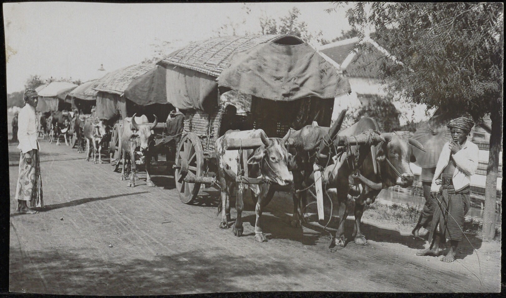 Stoet van vijf door koppels karbouwen getrokken overhuifde karren