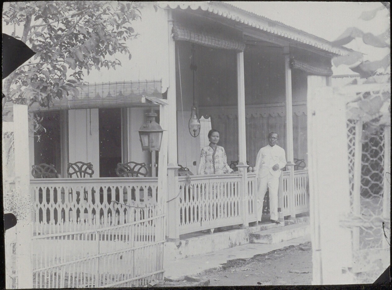 Indo-Europees echtpaar op de voorgalerij van hun woning