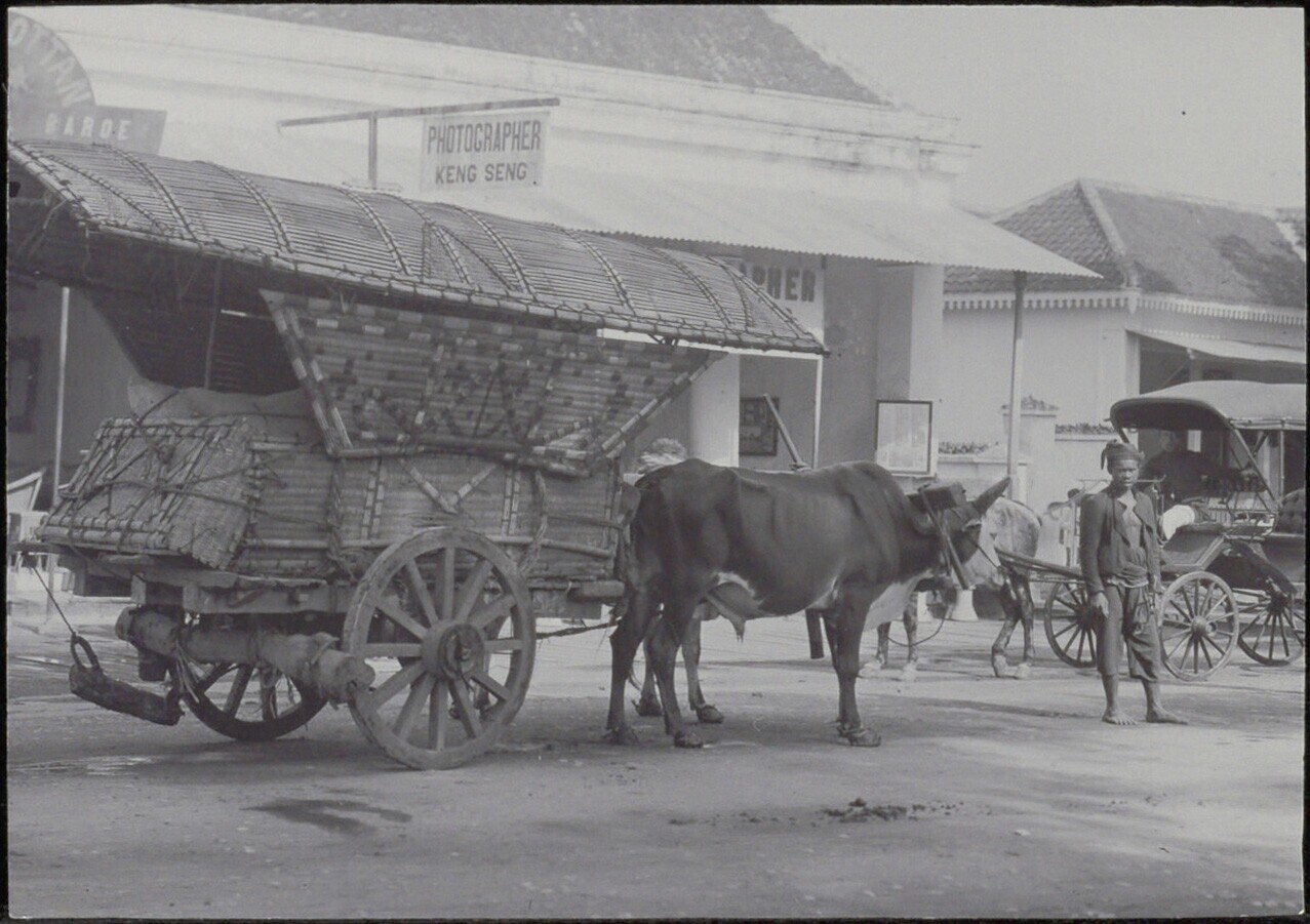Door twee ossen getrokken tweewielige huifkar met inheemse begeleider voor het pand van Fotograaf Keng Seng