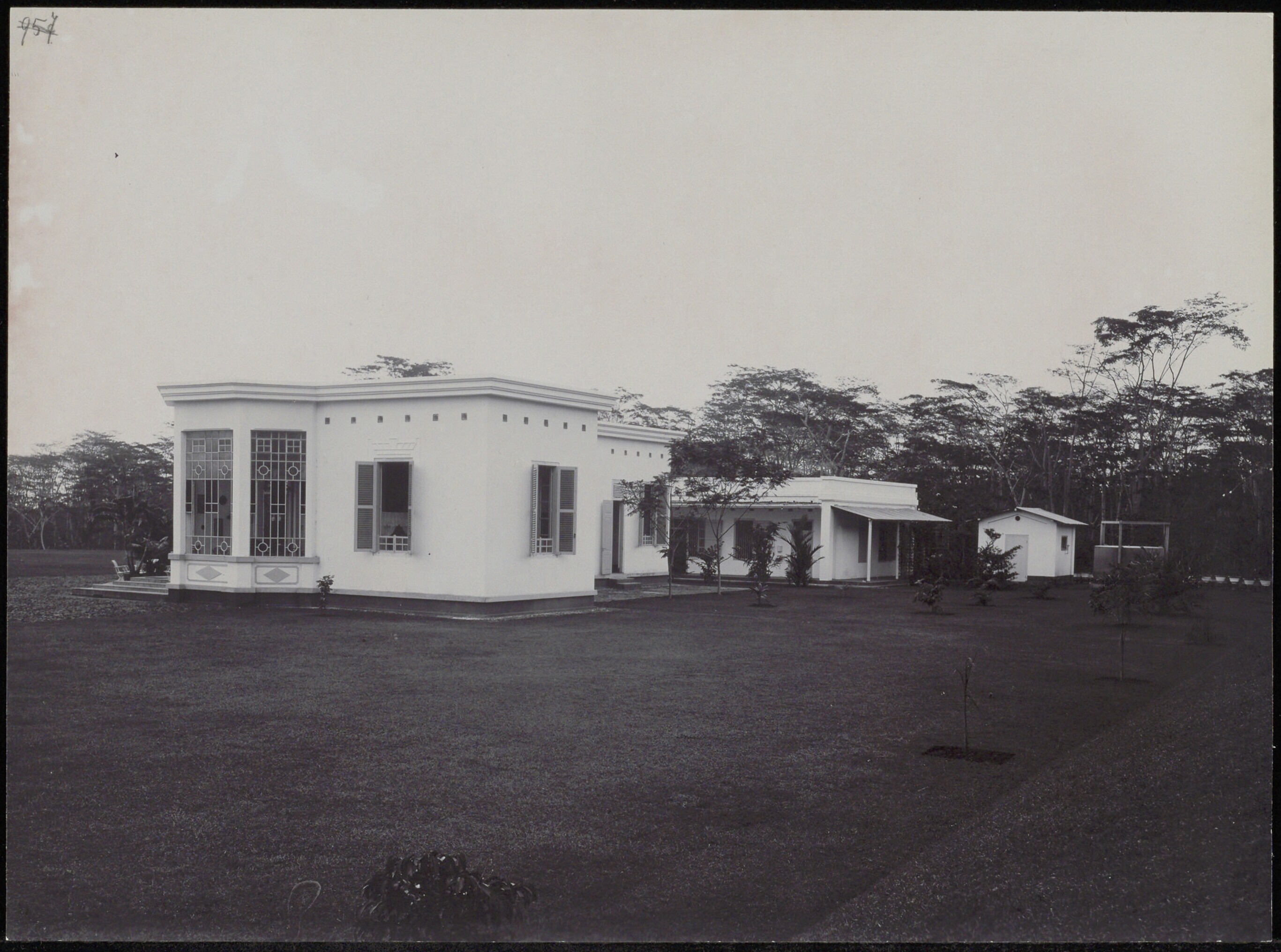 Gebouw gezien van de zij- en achterzijde met glas-in-lood vensters, een aanbouw en een bijgebouwtje