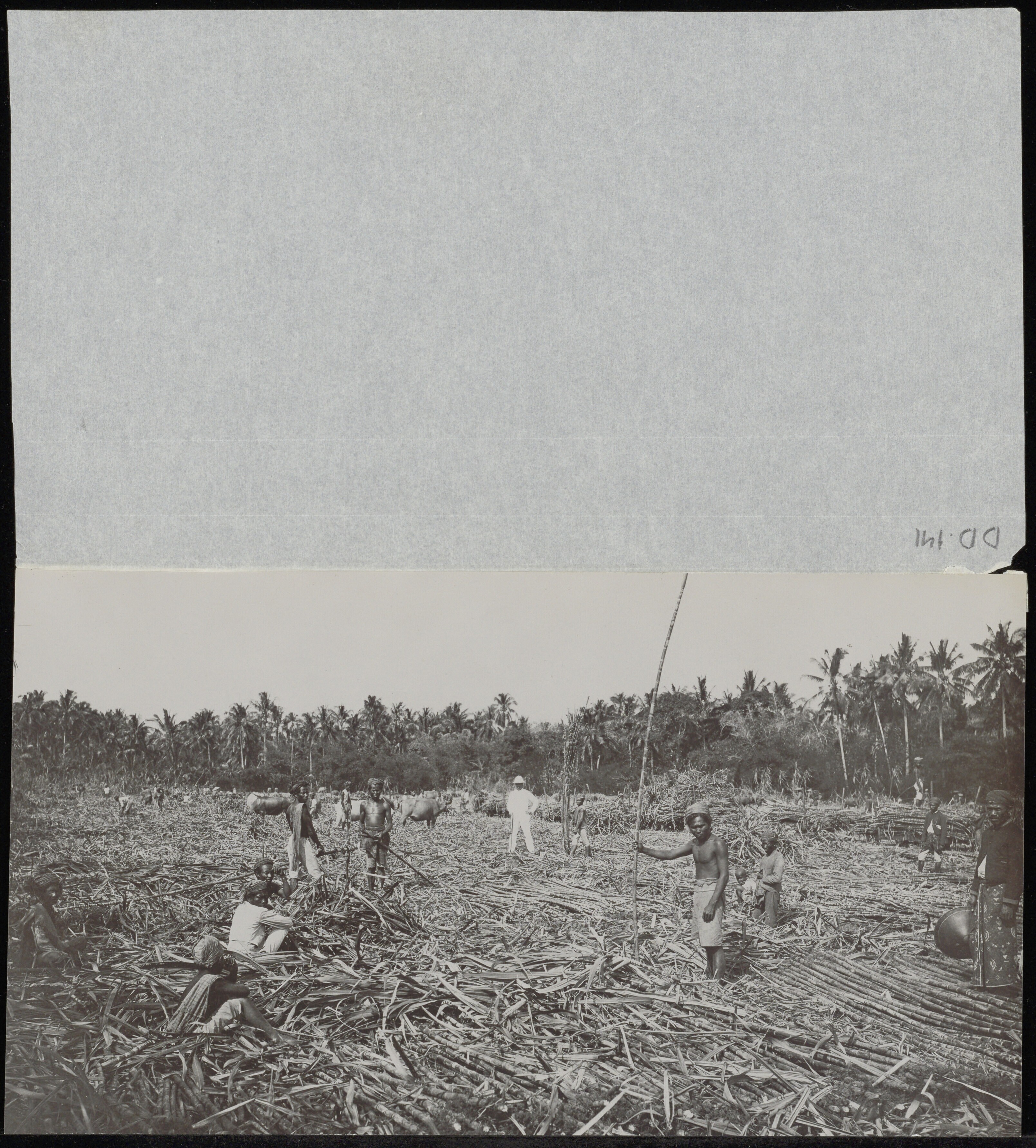 Arbeiders en een opzichter in een veld met gekapt suikerriet