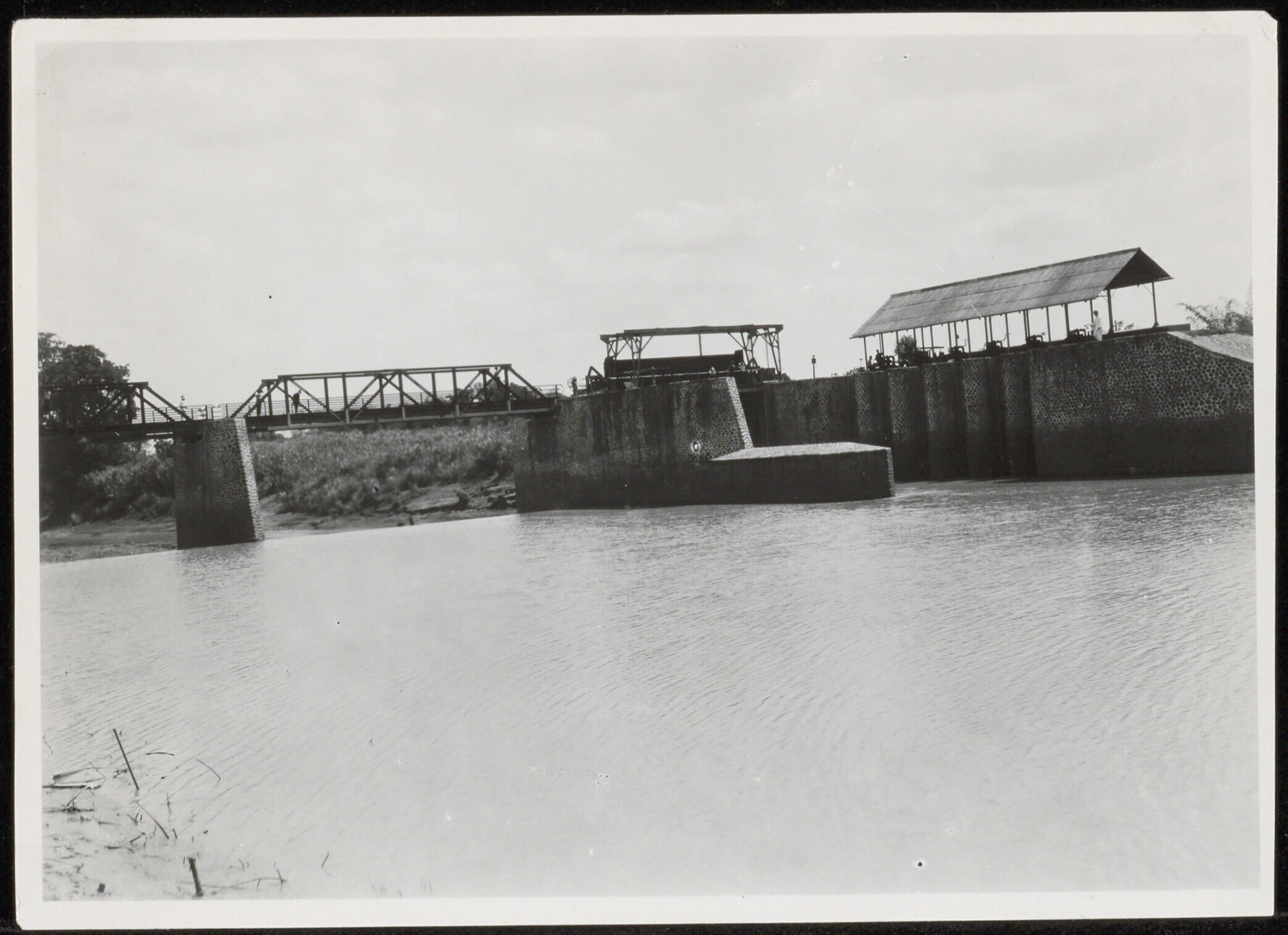 Irrigatiewerken en sluizen in een rivier voor sawahbevloeiing