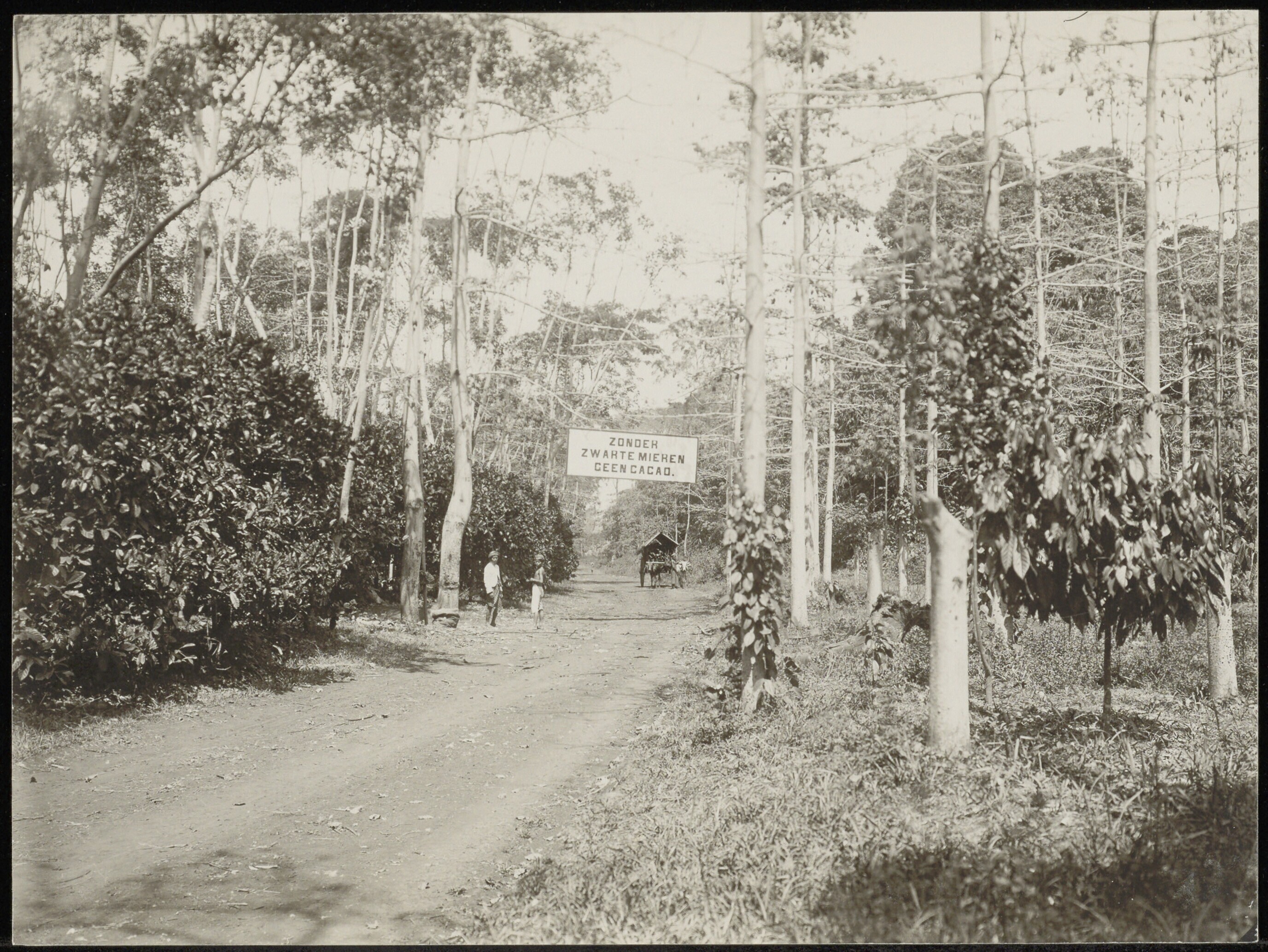 Gezicht op een cacao-tuin aan de rechterzijde, waartussen kapokbomen met links een Liberia koffietuin
