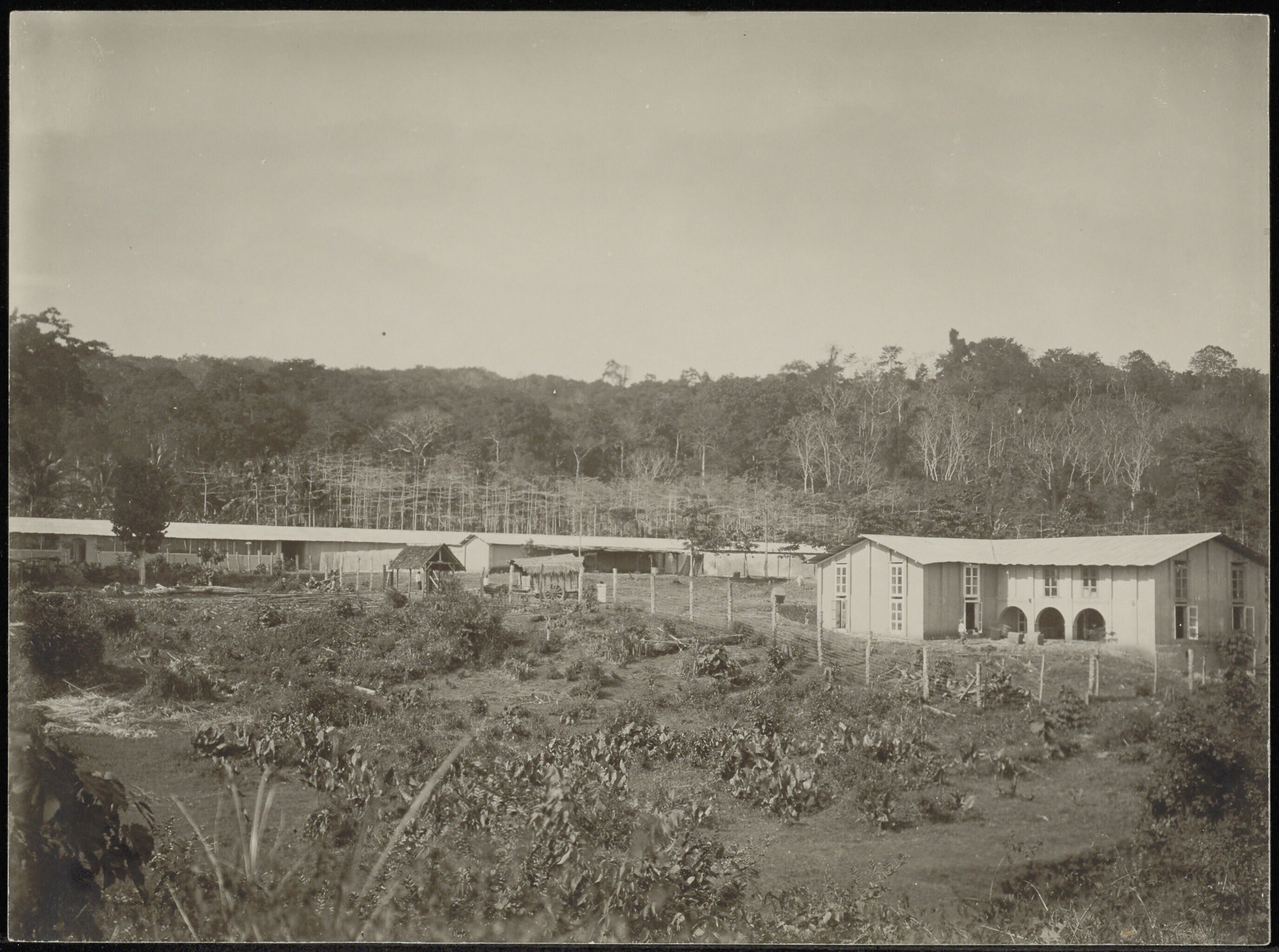 Panorama van het Kapok Etablissement met op de achtergrond een tuin met kapokbomen