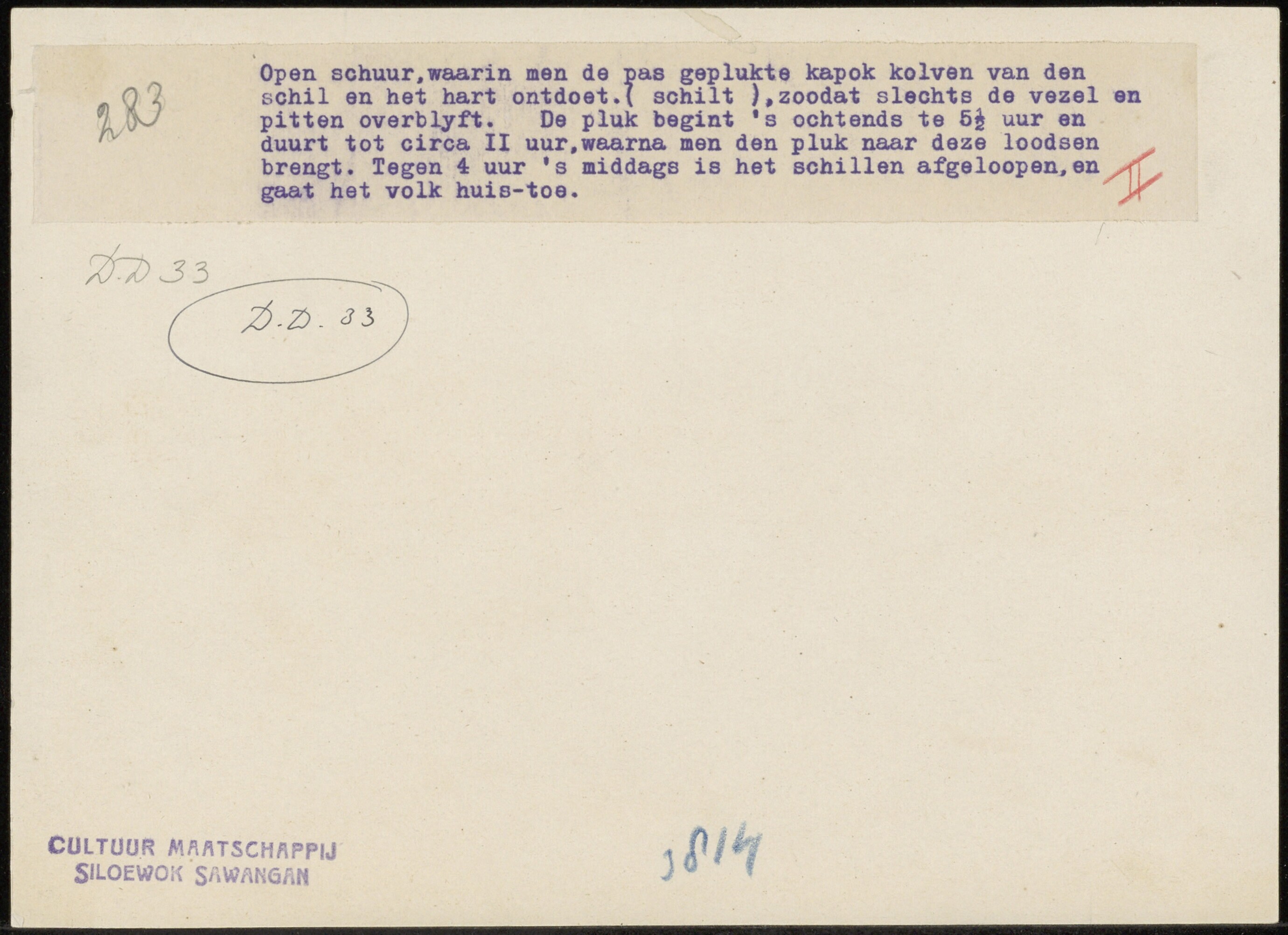 Schuur voor het schillen van kapokkolven op een onderneming van de Cultuur Maatschappij Sawangan