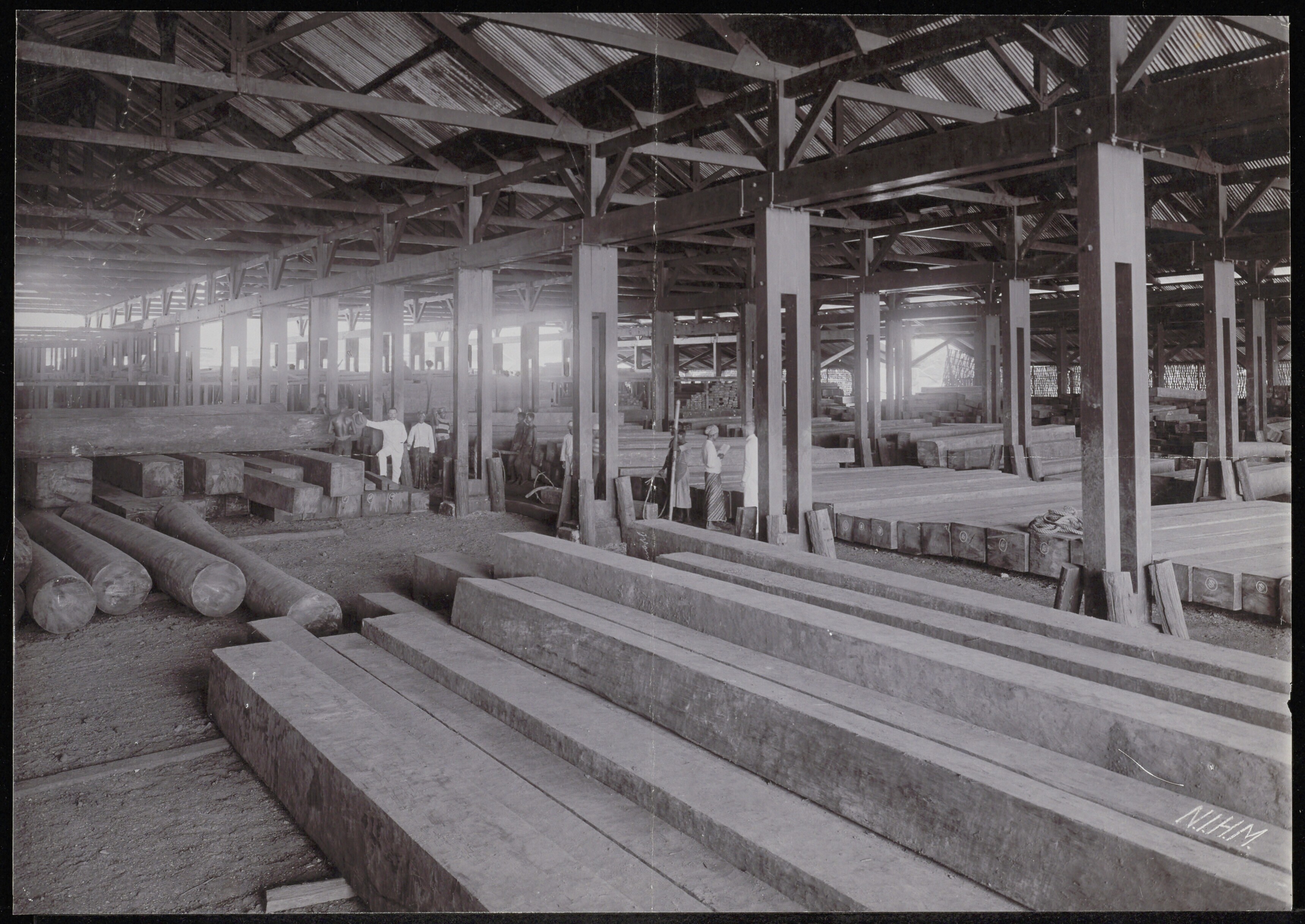 Opslag van groot djati-hout bij de Nederlandsch-Indië Houthandel Maatschappij