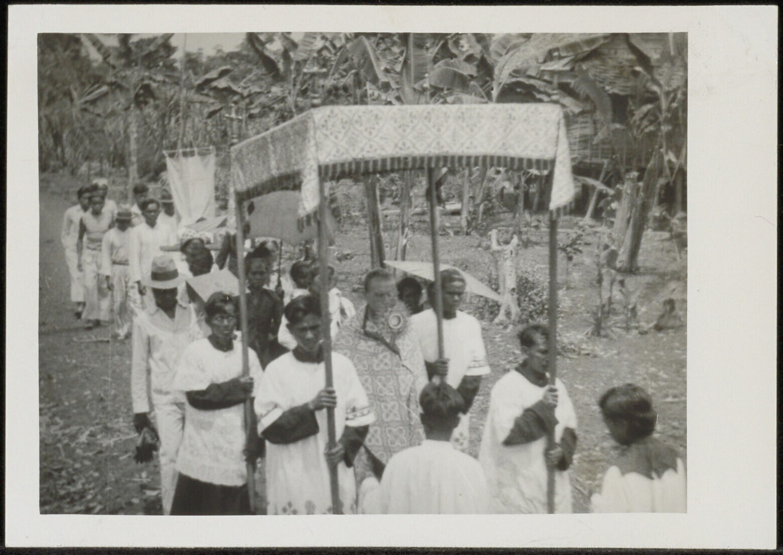 Rooms-katholieke processie met onder het baldakijn een priester met een monstrans