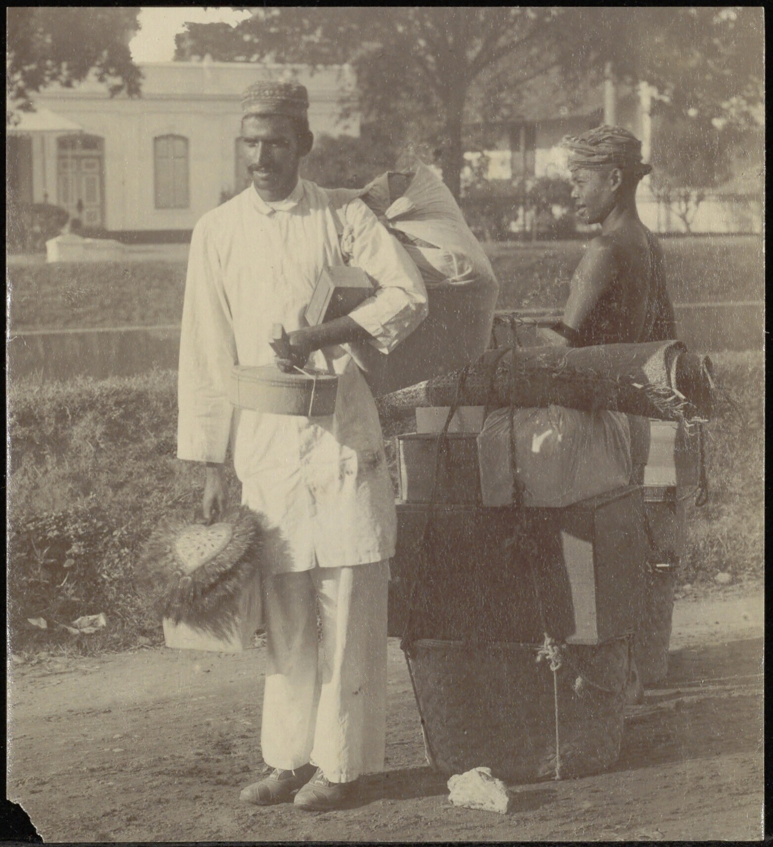 Twee mannen bepakt en bezakt, mogelijk met koopwaar