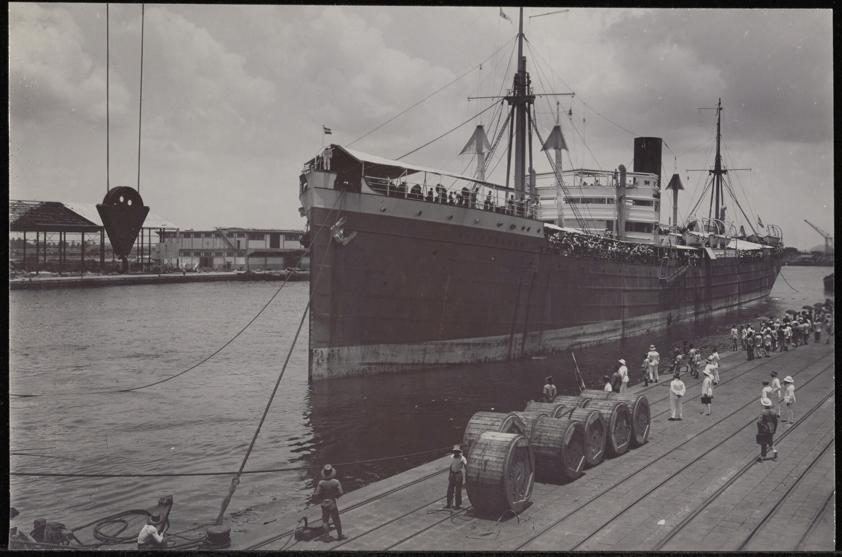 Het aanmeren van een schip in de haven van Tandjong Priok Batavia