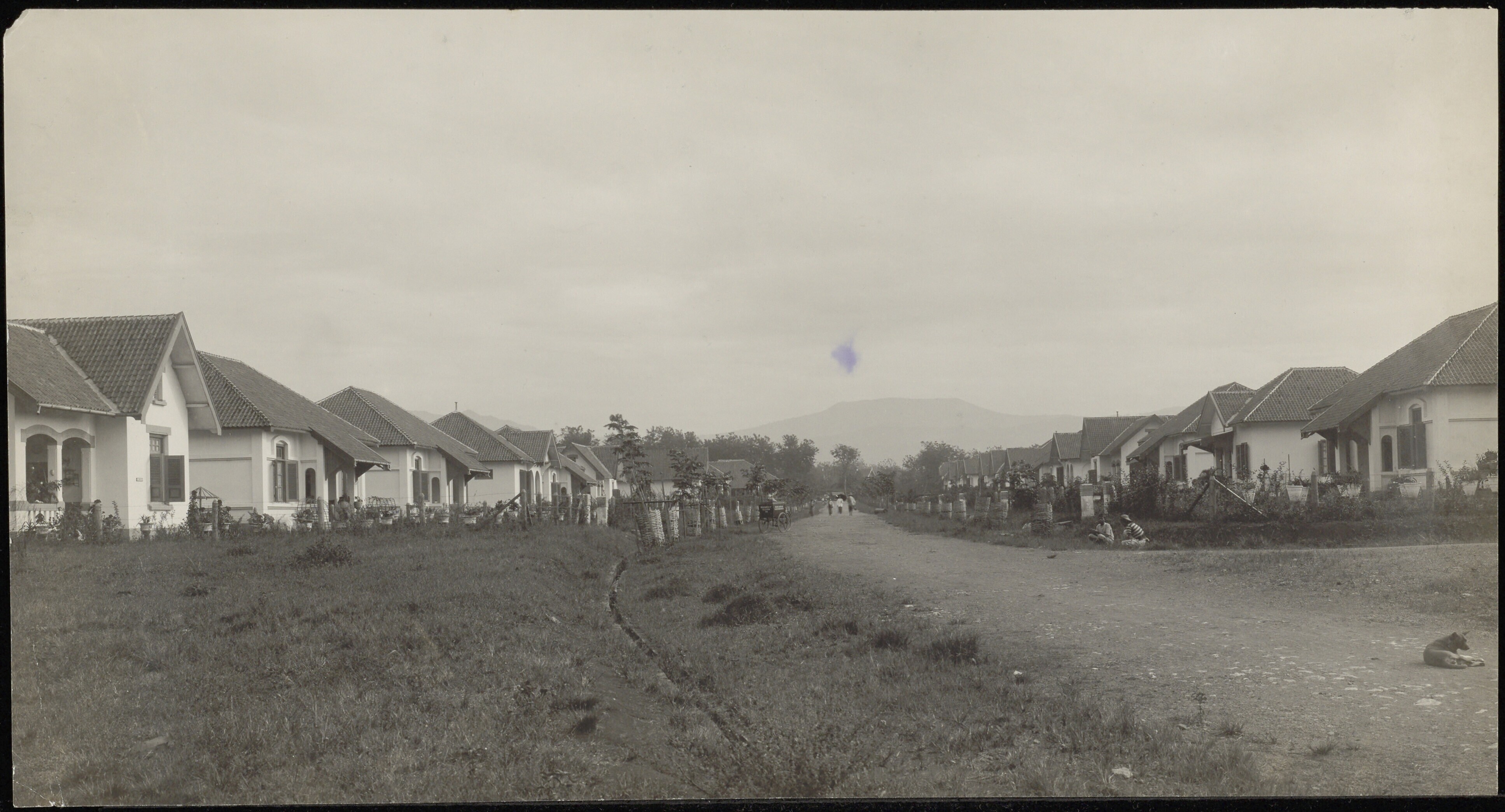 Een weg met aan weerszijden een rij losstaande stenen seriewoningen