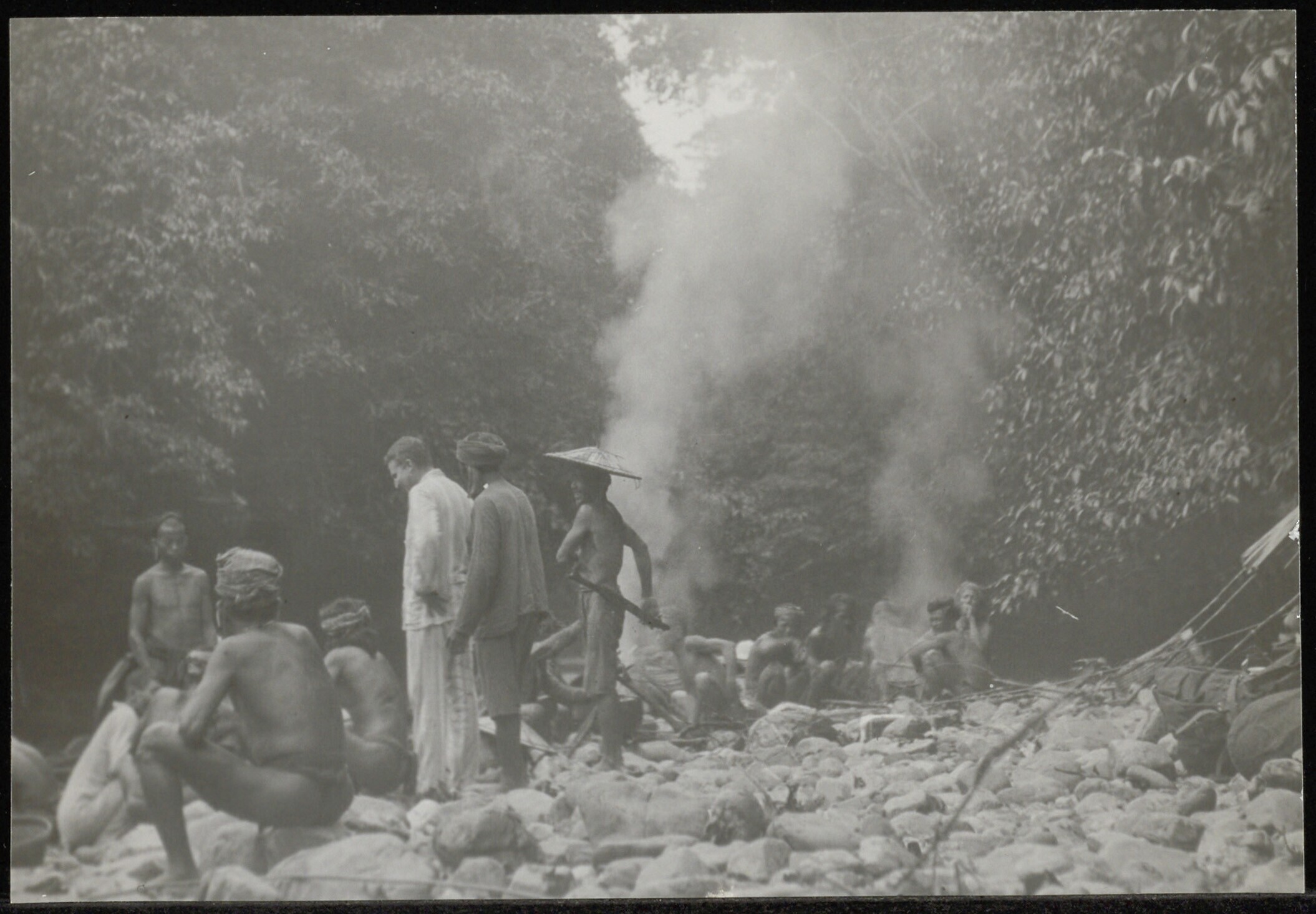 Bivak van een expeditie aan de Barito-rivier met een Europeaan en leden van de inheemse bevolking