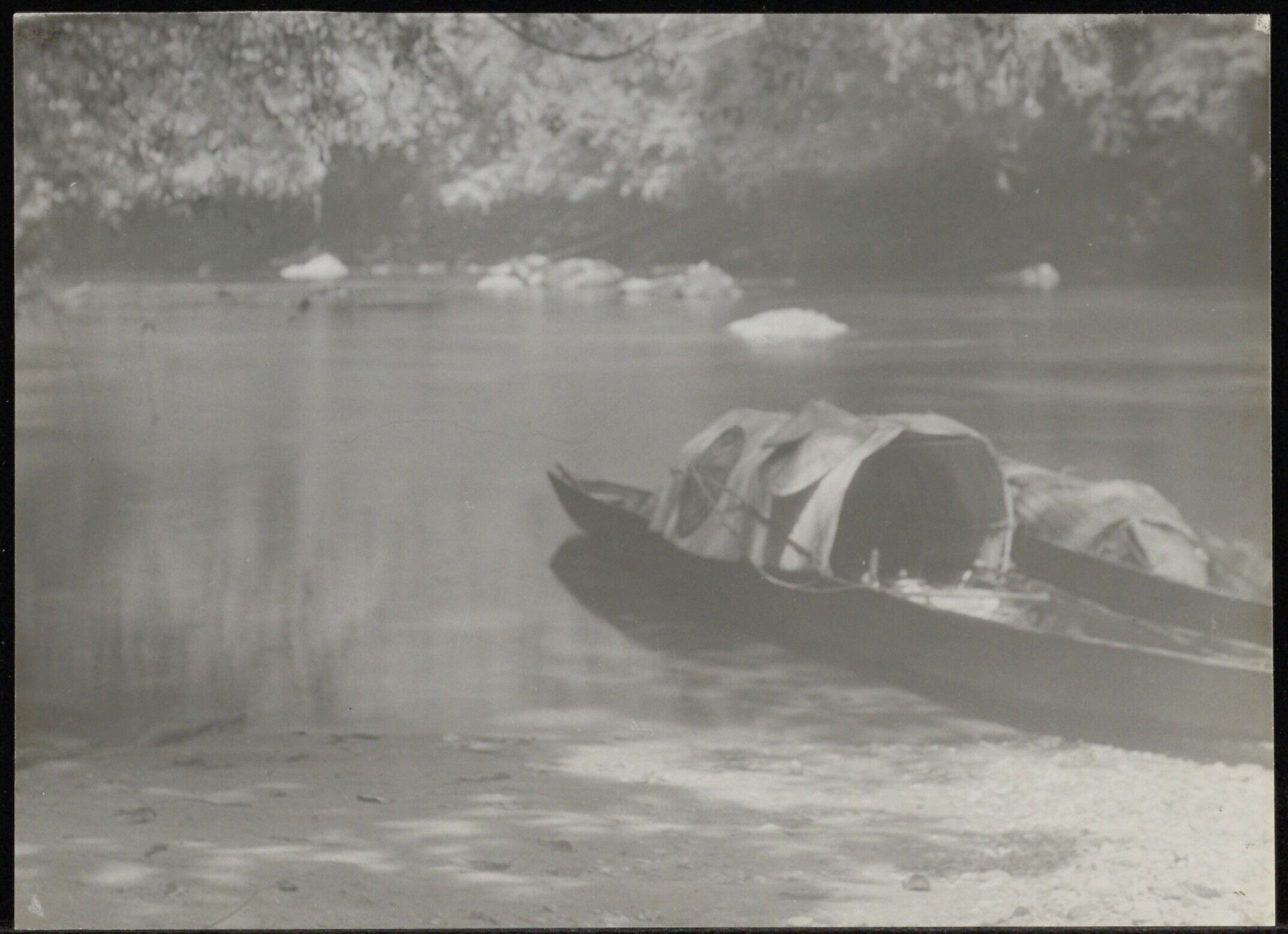 Aangemeerde prauw bij bivak van expeditie aan de rivier de Barito