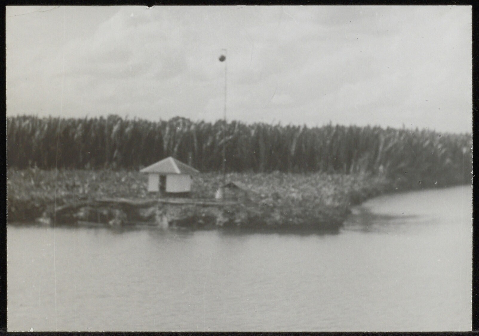Oever van een rivier-arm met een schip van de Koninklijke Pakketvaart Maatschappij
