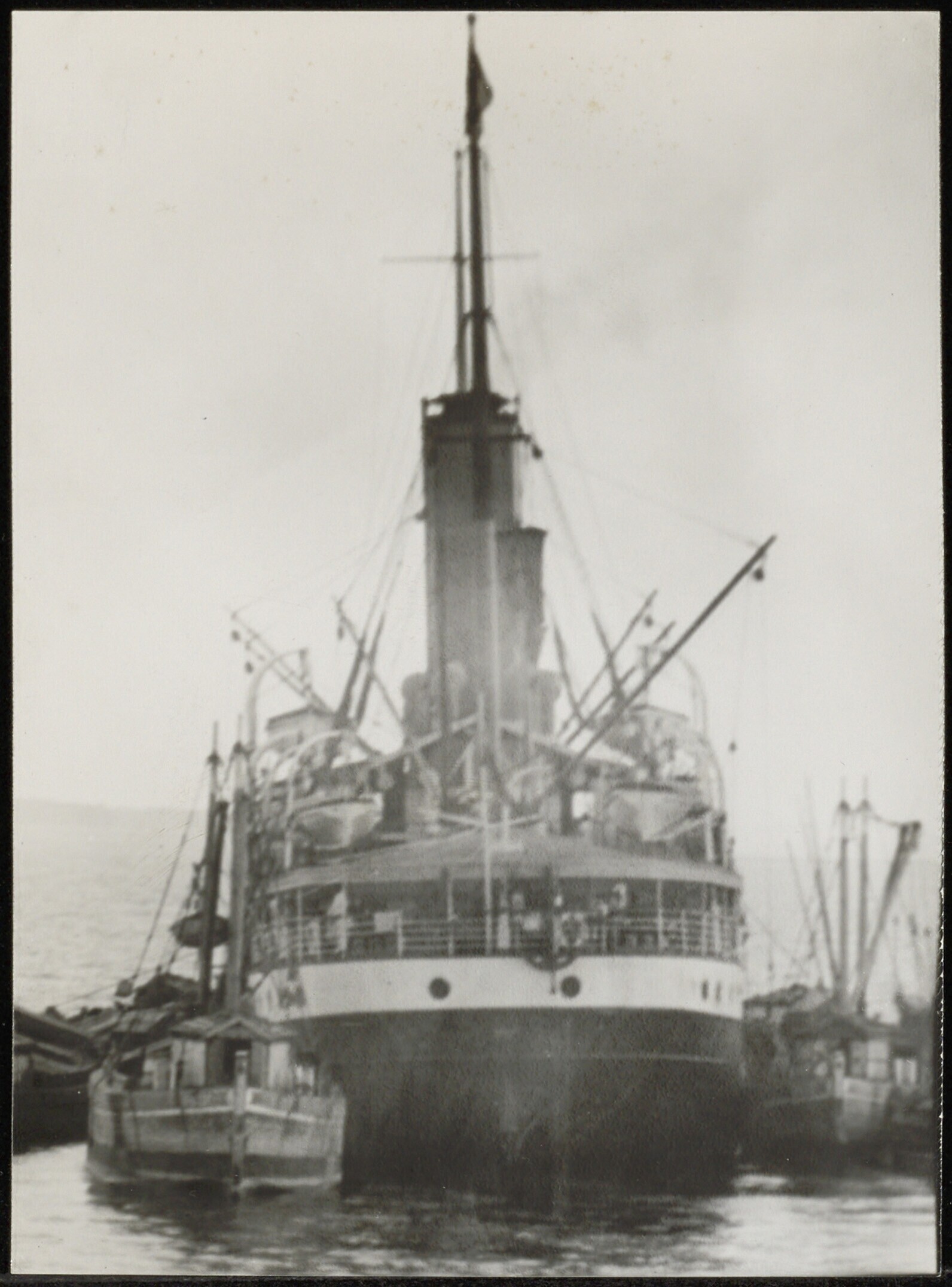 De achtersteven van een schip van de Koninklijke Pakketdienst Maatschappij met loodsboten