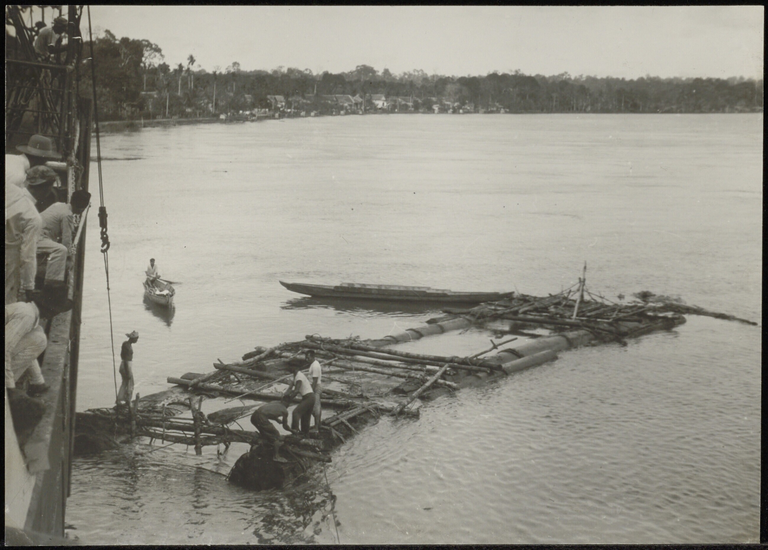 Aan- en afvoer op de rivier met behulp van houtvlotten, gezien vanaf een schip van de Koninklijke Pakketdienst Maatschappij