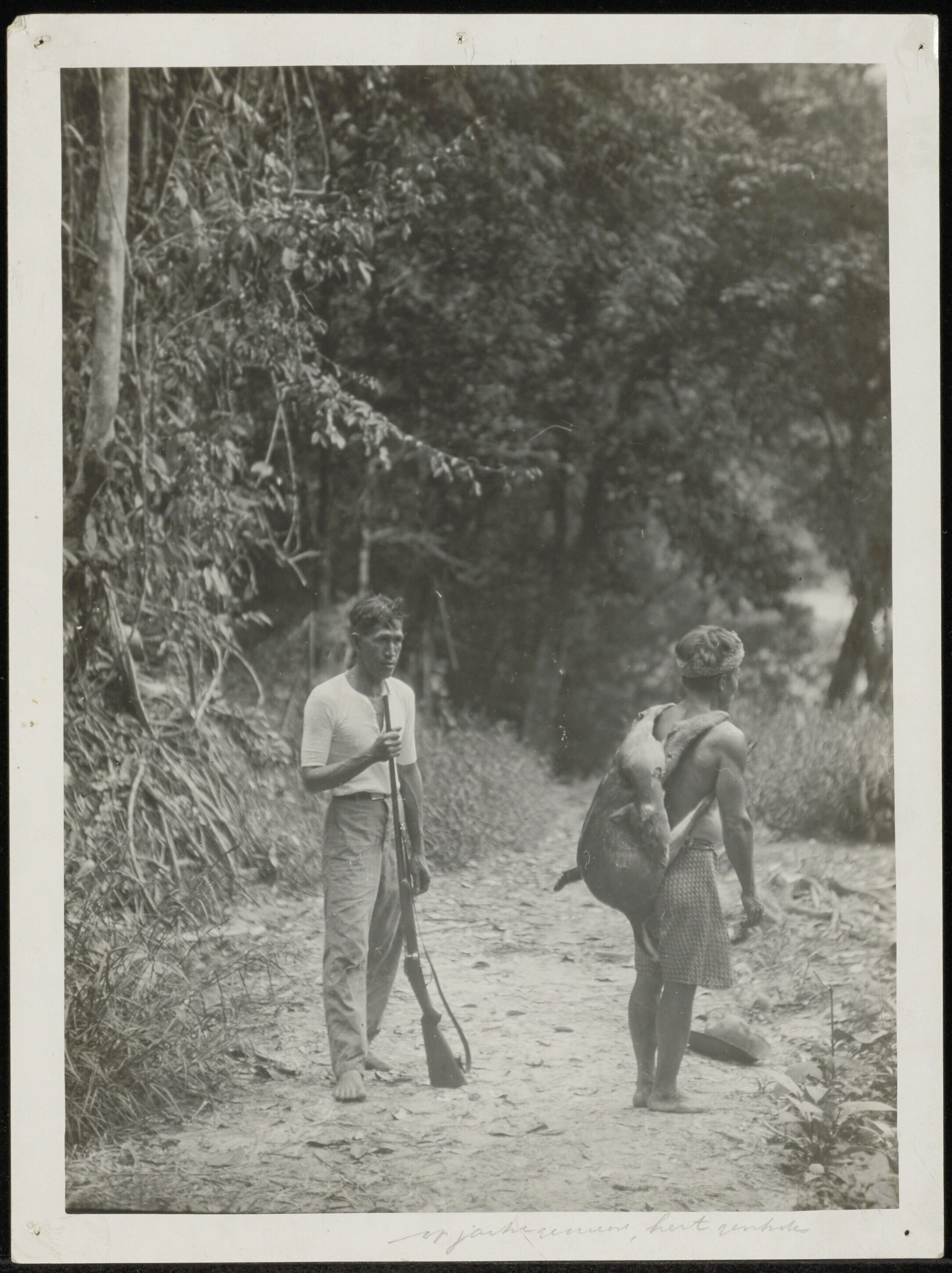 Jager met geschoten hert, door inheemse man op de rug gedragen