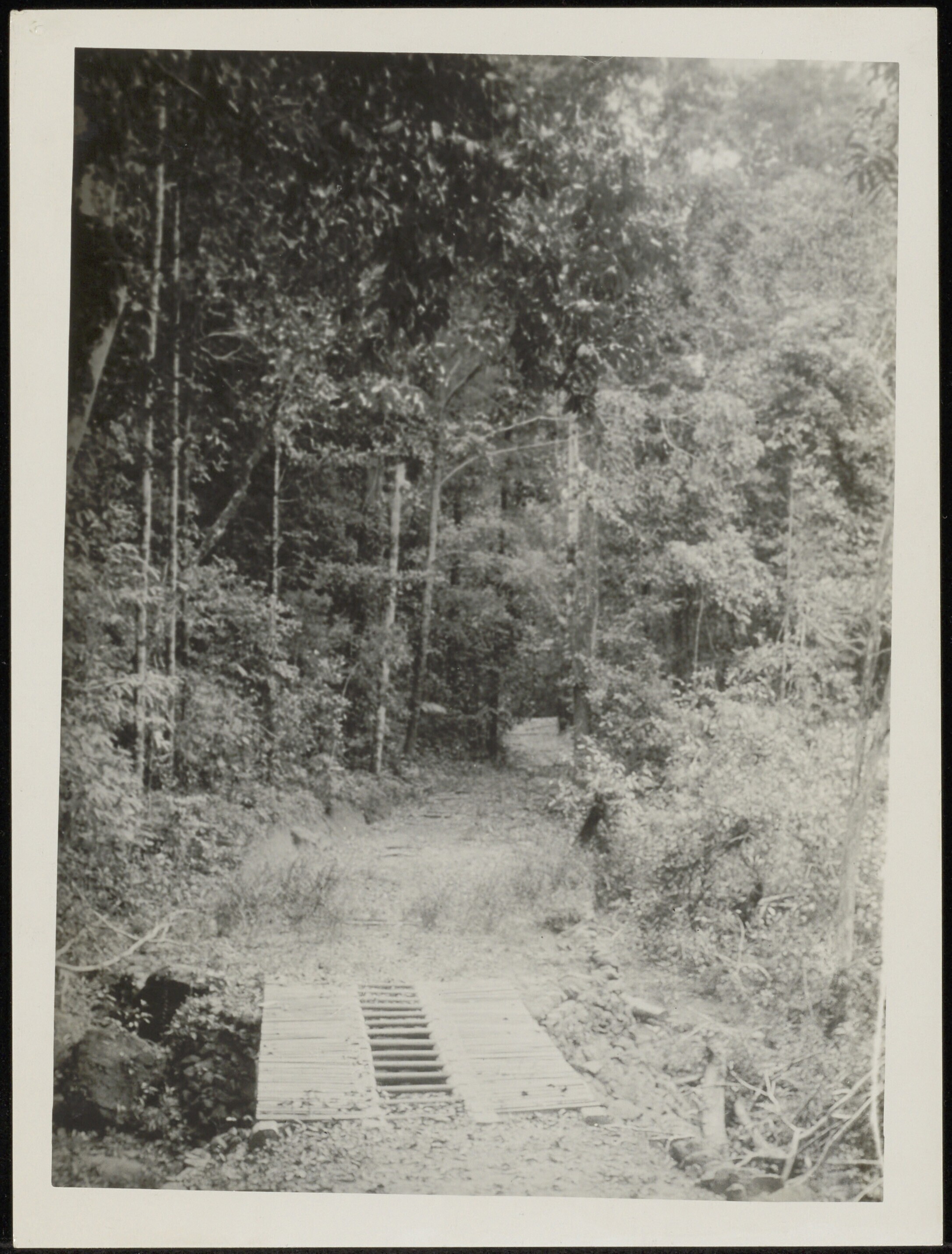 Pad door bos met op de voorgrond een primitieve houten brug over een greppel