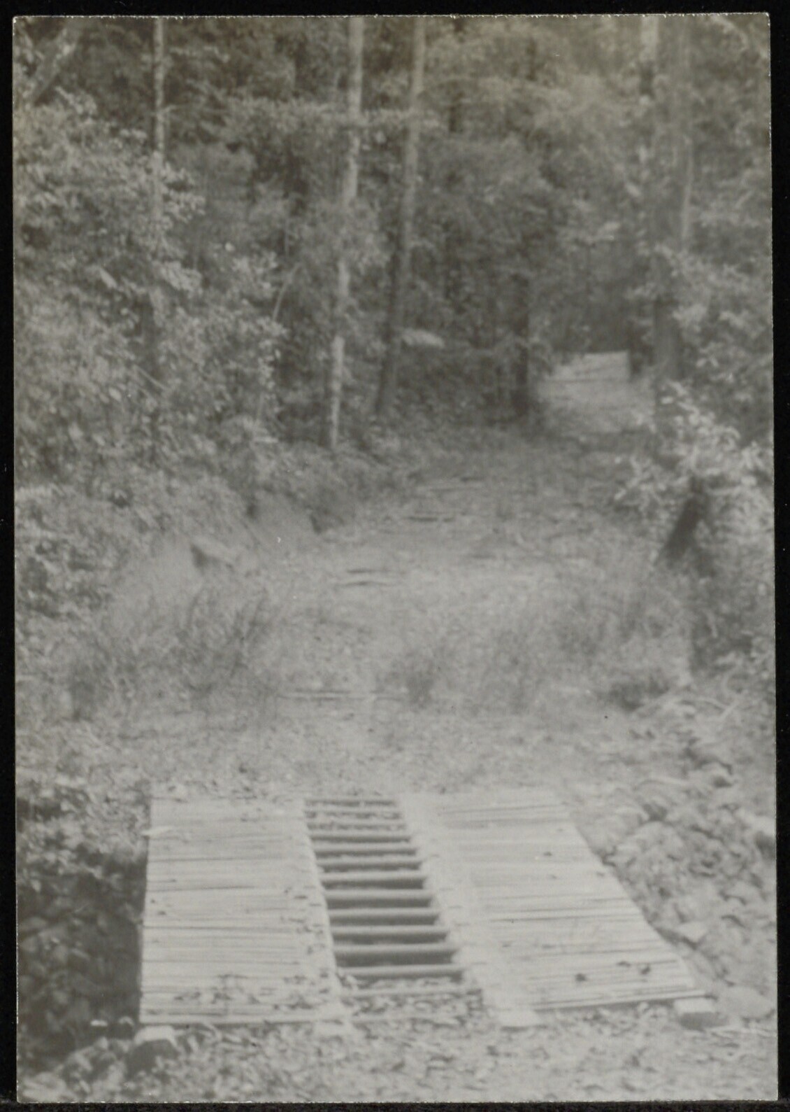 Pad door bos met op de voorgrond primitieve houten brug over een greppel