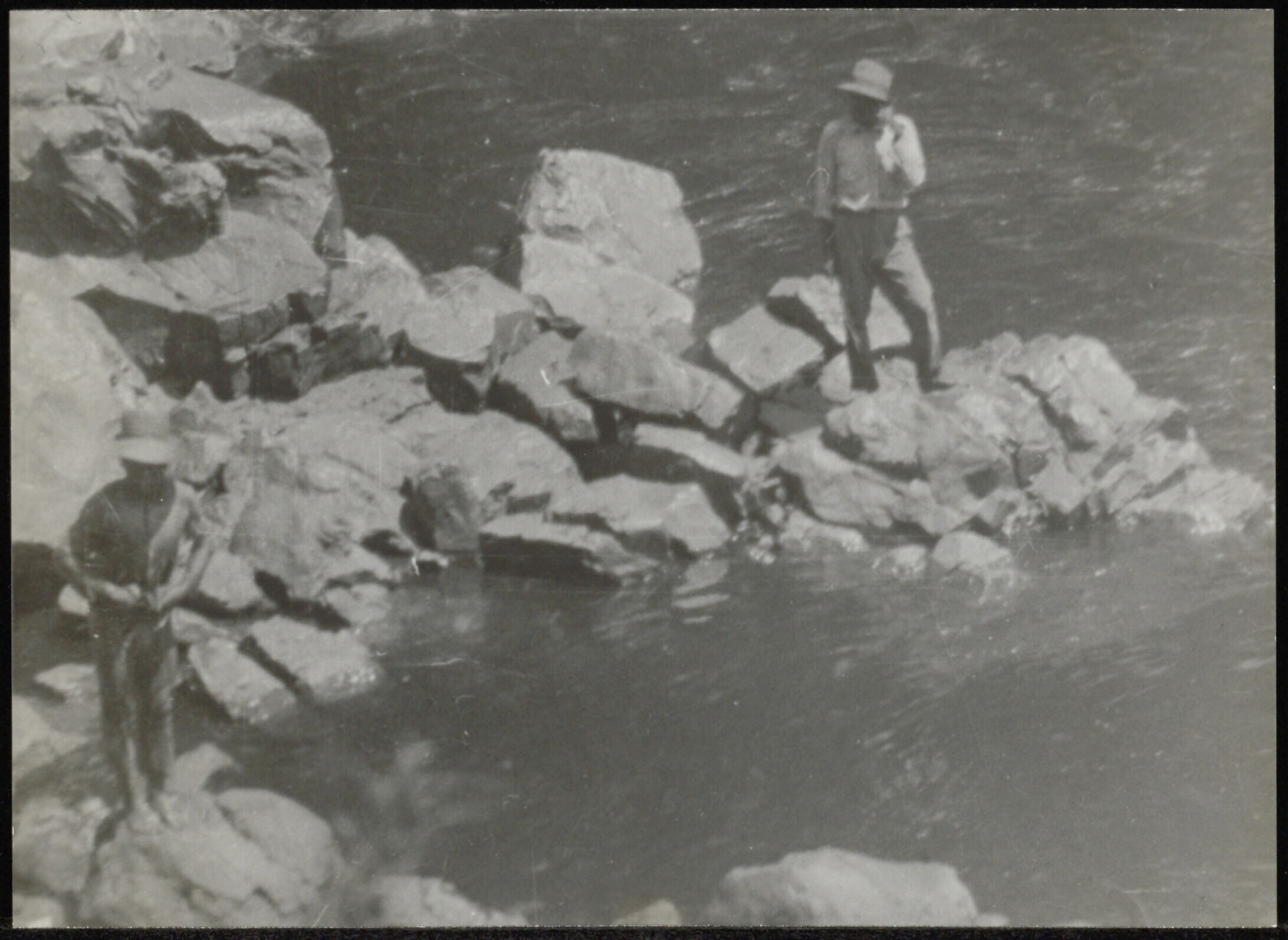 Twee mannen staand op rotspartij aan de oever van de Barito