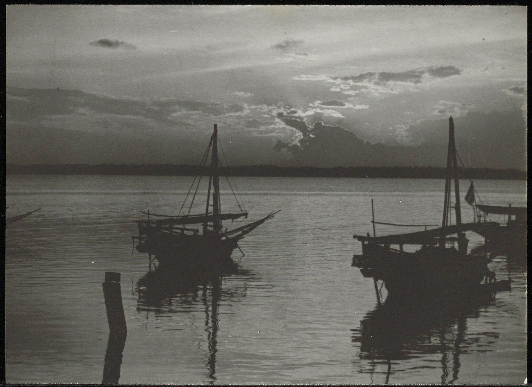 Aangemeerde prauwen voor de havenstad Balikpapan