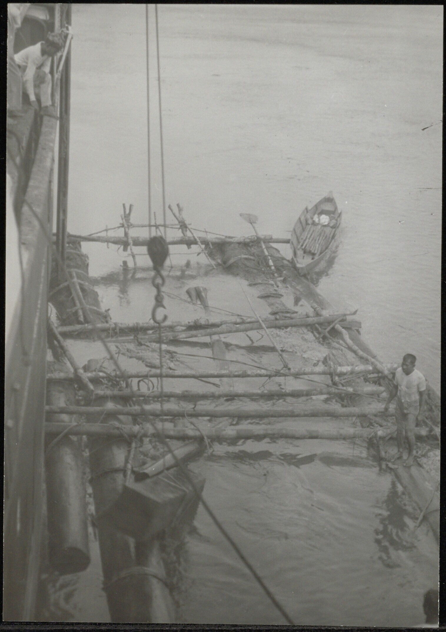 Arbeiders laden een schip met hout vanaf een vlot met boomstammen op de rivier