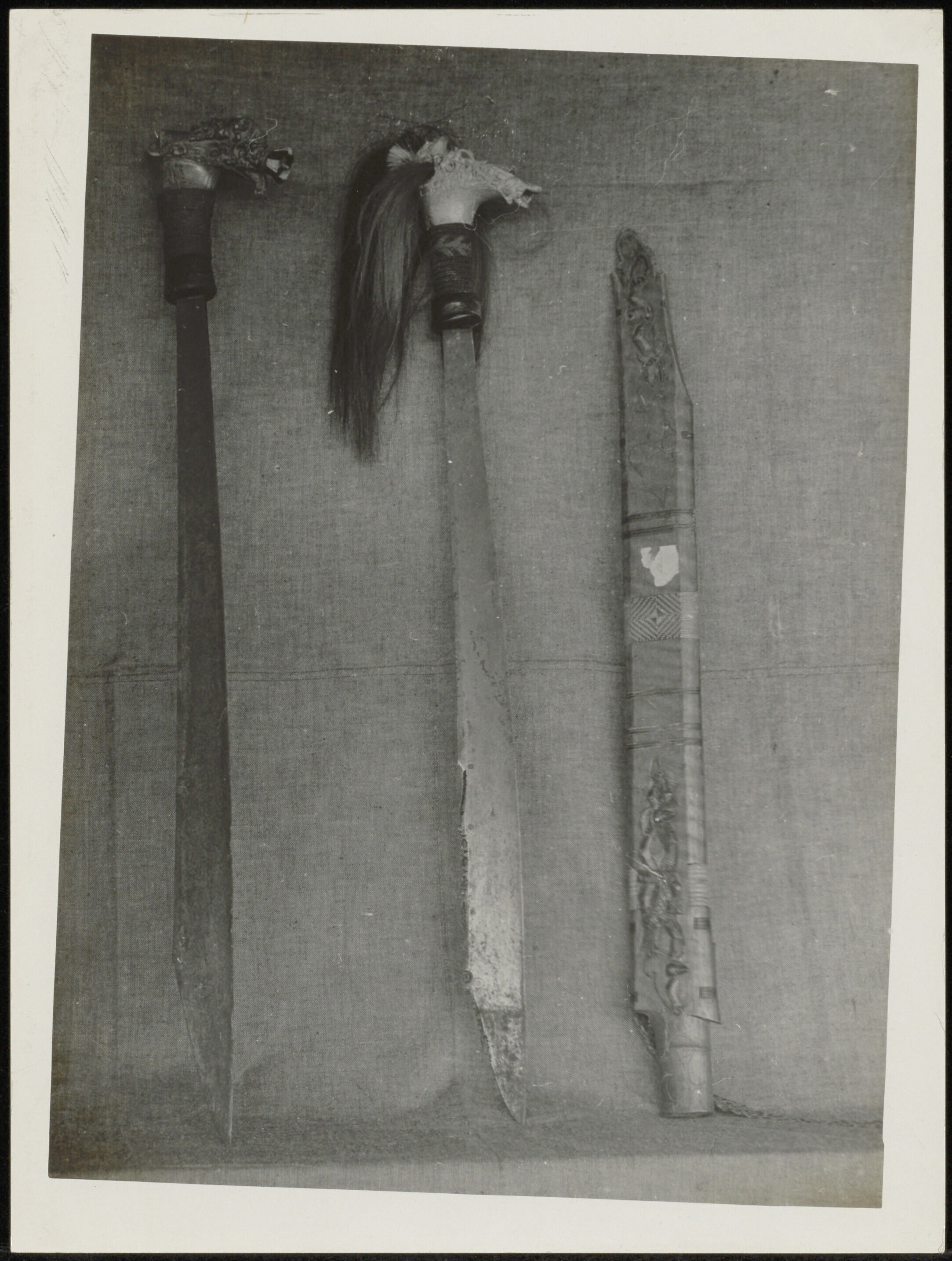 Een zwaard van Borneo en een mandau, beide met bewerkt gevest en een versierde houten schede