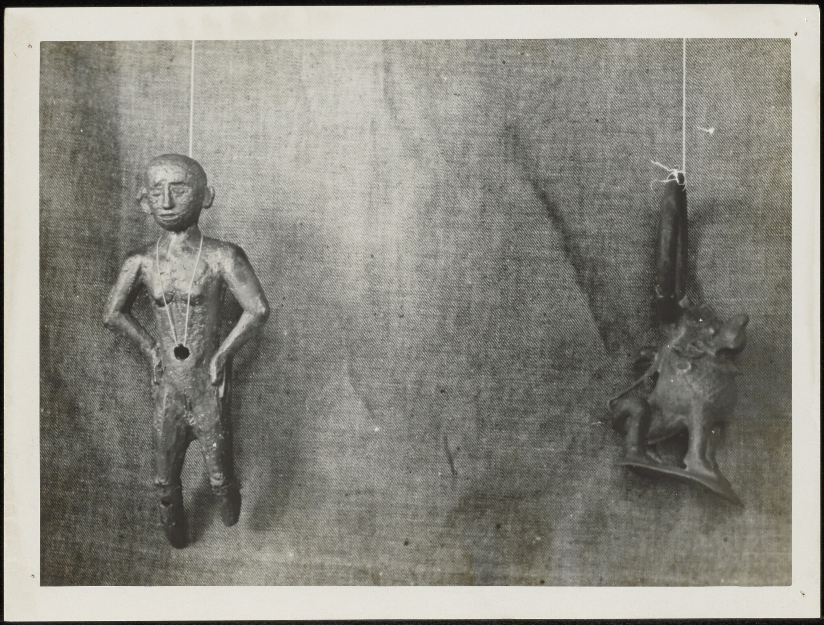 Voetloze menselijke figuur van hout en een dierfiguur hangend aan een ring