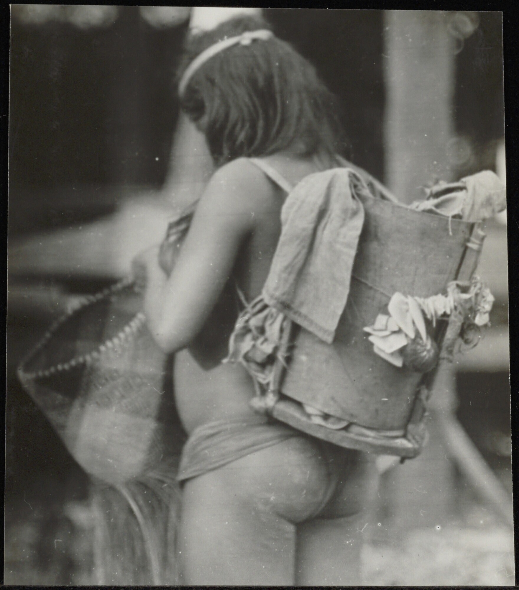 Een mand vlechtende Punan-Dayak vrouw met versierde draagmand op haar rug