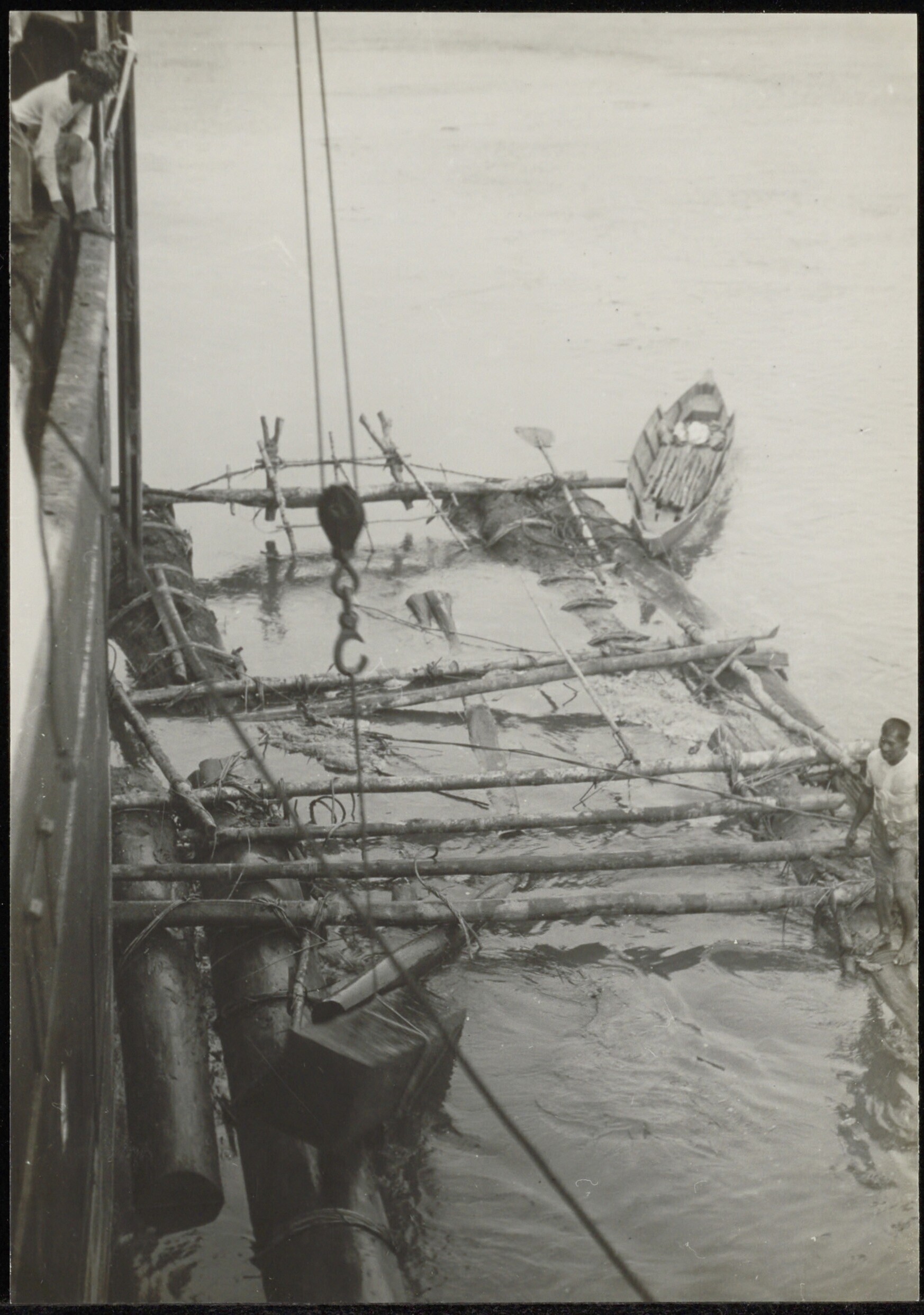 Arbeiders laden een schip met hout vanaf een vlot met boomstammen op de rivier