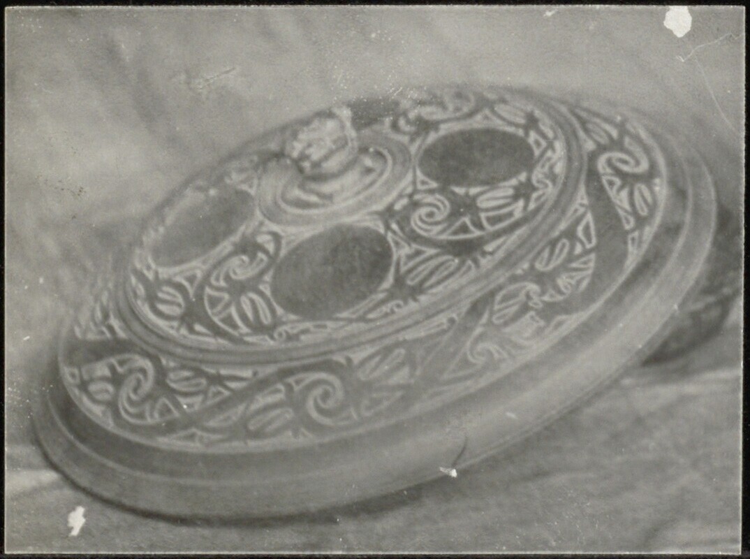 Knopdeksel van koperen schaal met ingegraveerde patronen