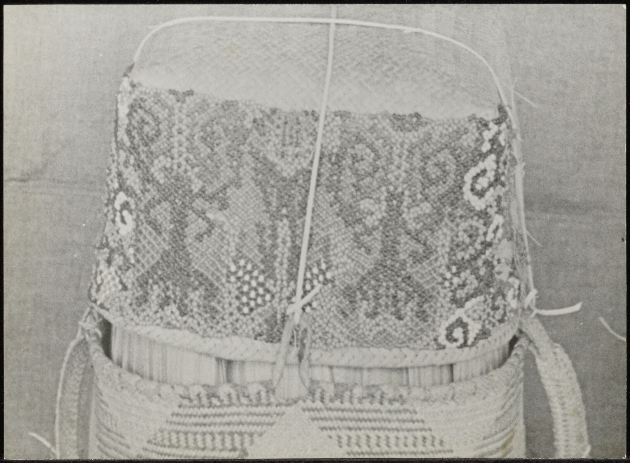 Gevlochten draagtas met deksel waarop specifieke motieven zijn aangebracht