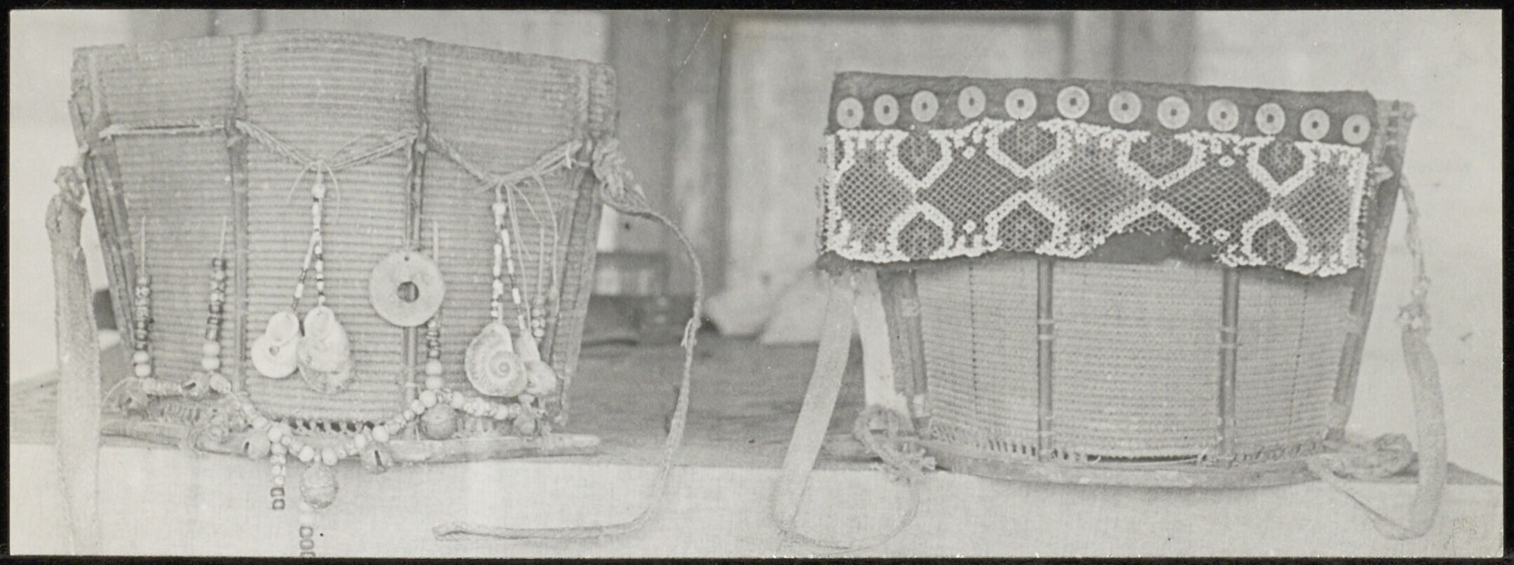 Gevlochten manden waarvan een versierd met kralen en de ander met kralen en amuletten