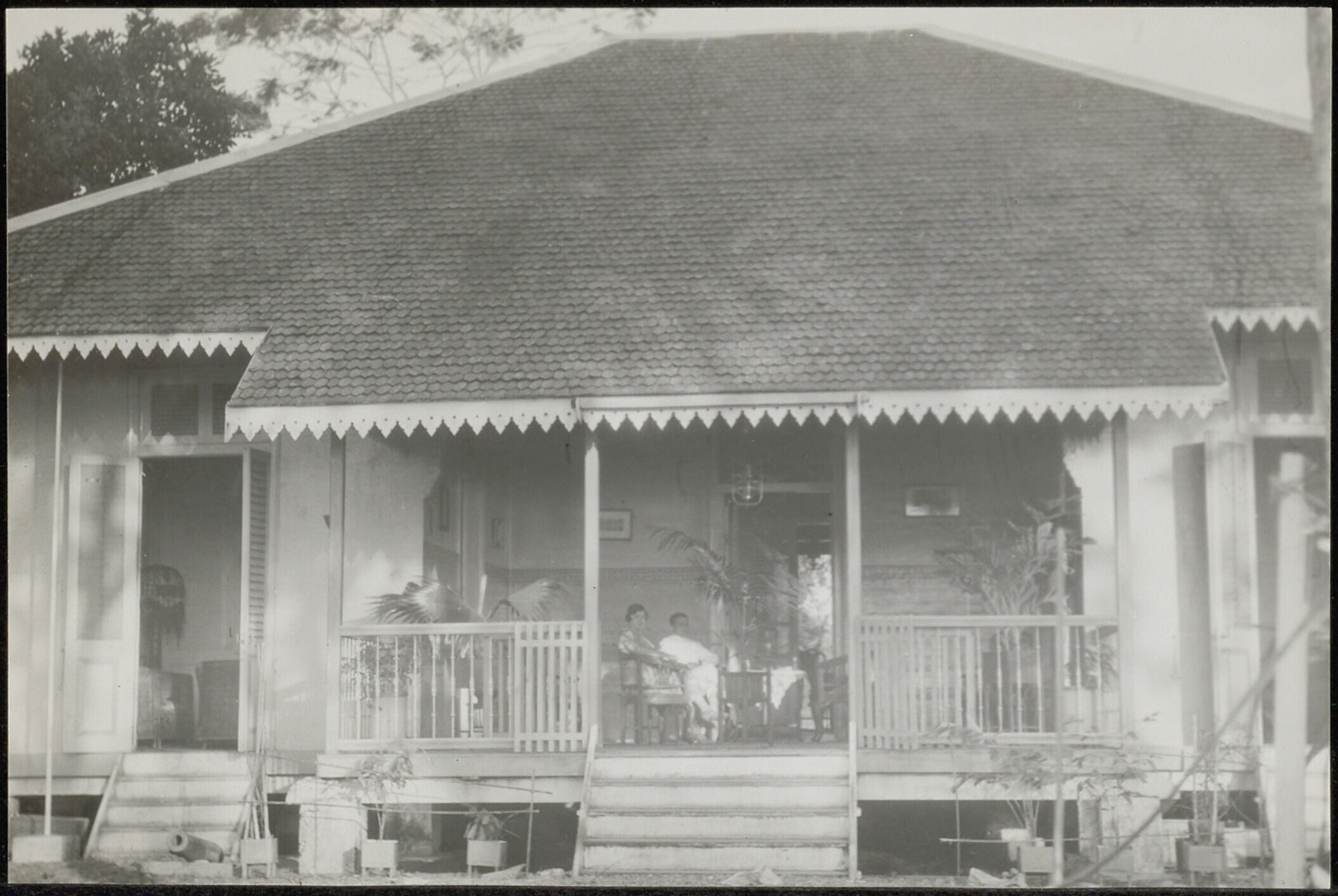 Man en vrouw zittend op de voorgalerij van een woonhuis in Tandjoeng Redeb Borneo