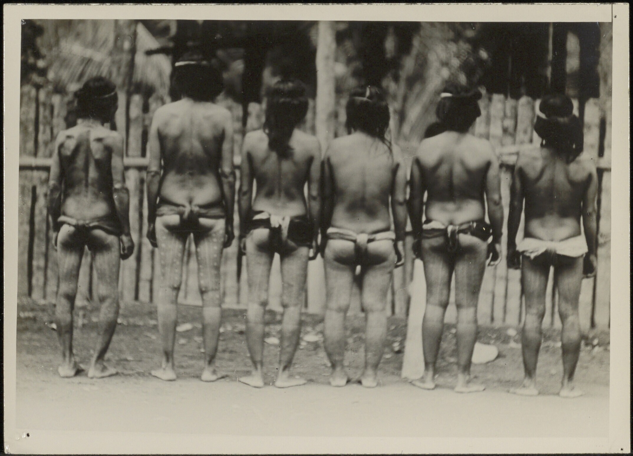 Dayak vrouwen uit het gebied van de Segah-rivier met getatoeëerde benen