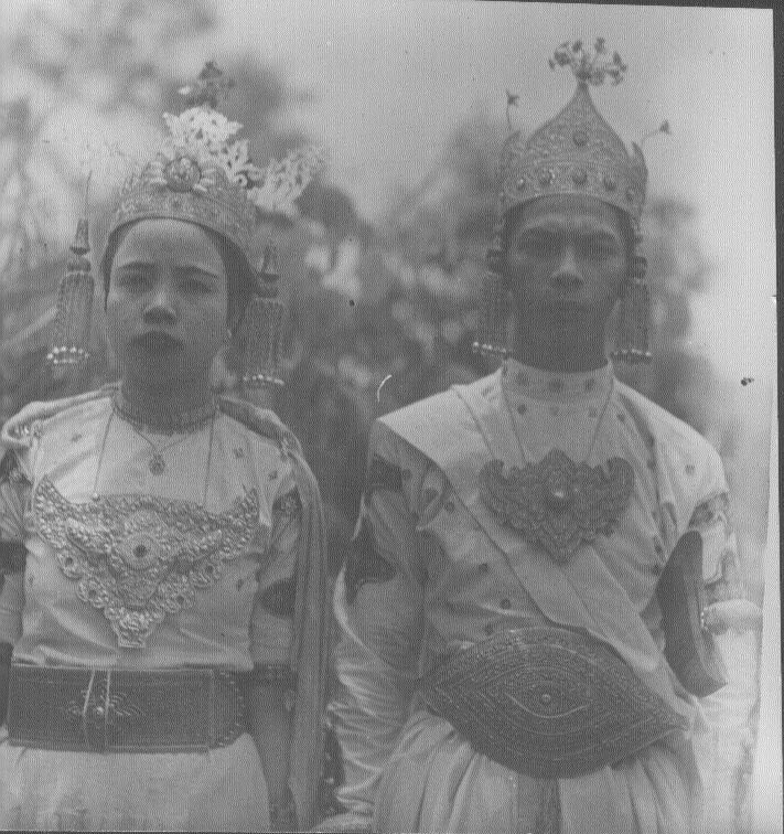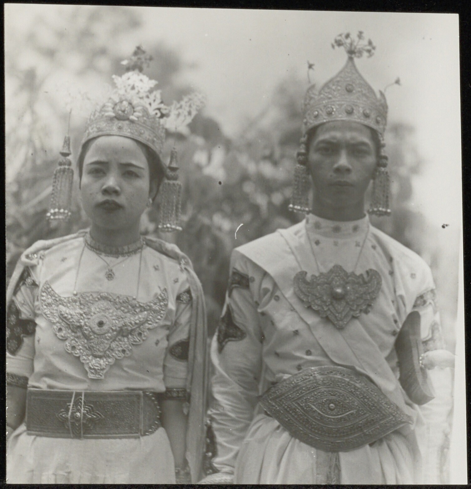 Groepsportret van een man en een vrouw van voorname afkomst te Tandjoeng Redeb in traditionele kleding