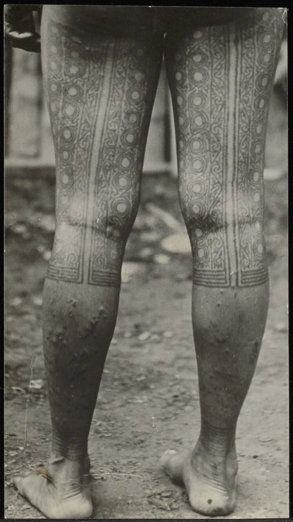 Getatoeëerde benen van een Dayak vrouw uit het gebied van de Segah-rivier