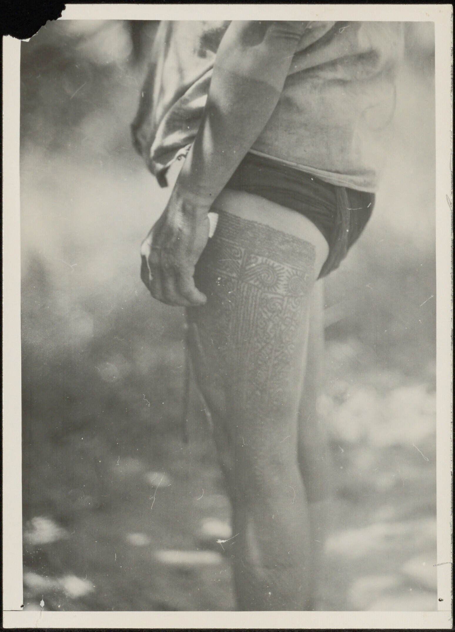 Getatoeëerde benen van een Dayak vrouw uit het gebied van de Segah-rivier