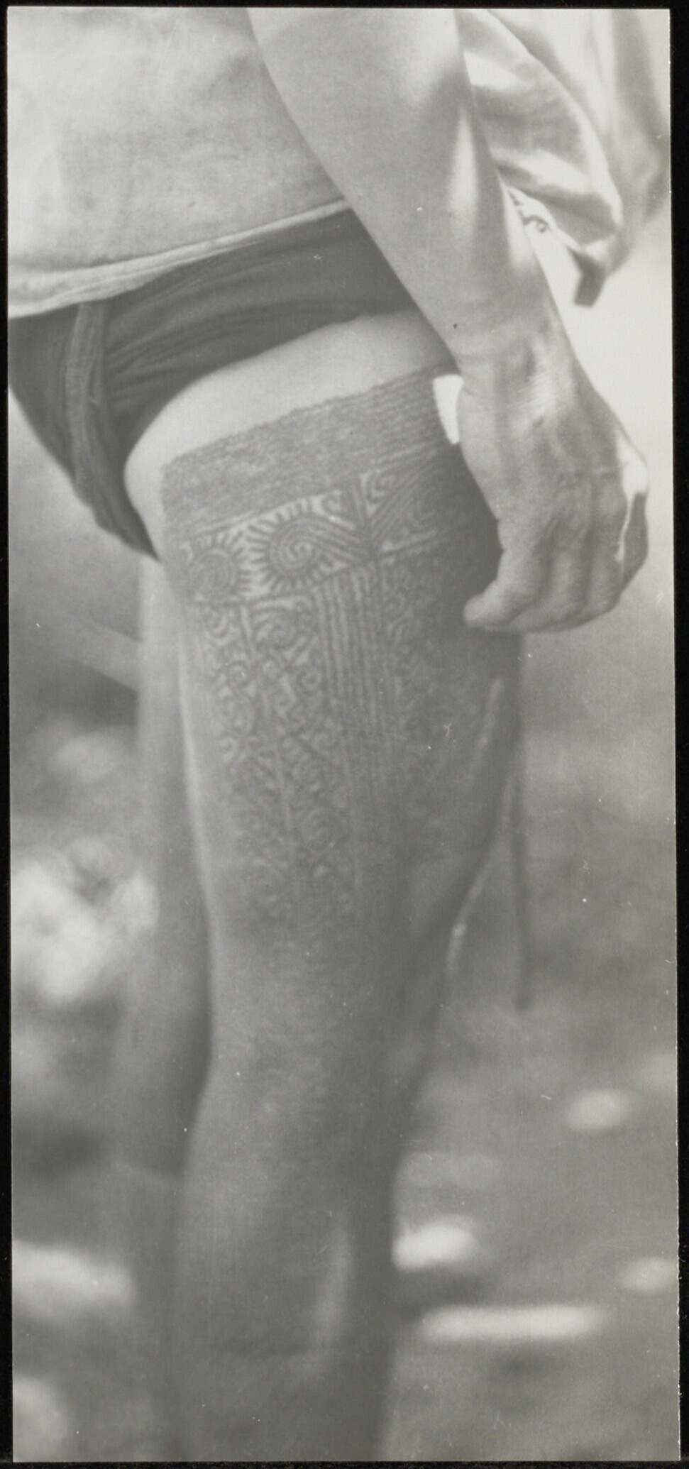 Dayak vrouw uit het gebied van de Segah-rivier met getatoeëerde benen van opzij gezien