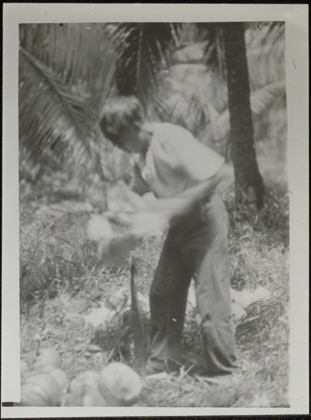Man bezig met het schillen van een klappervrucht