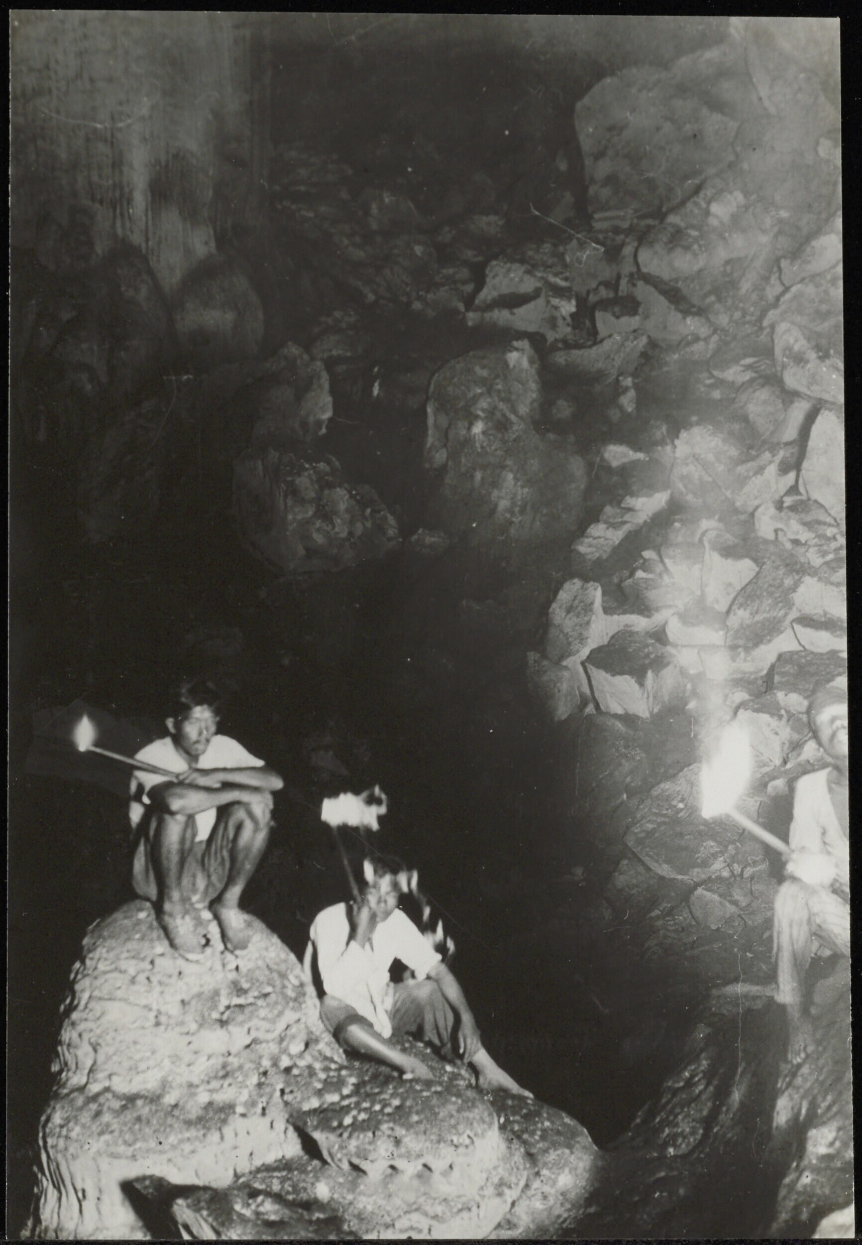 Drie Basap Dayak mannen in een grot in het gebied rond de Birang-rivier