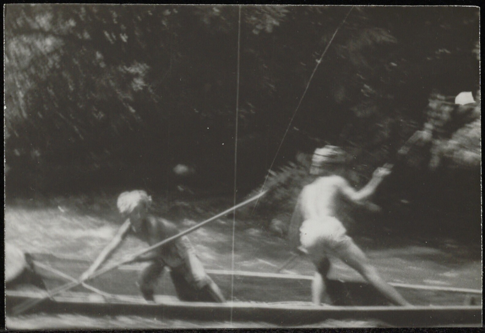 Prauw met twee mannen bij een stroomversneling in de Kelai-rivier