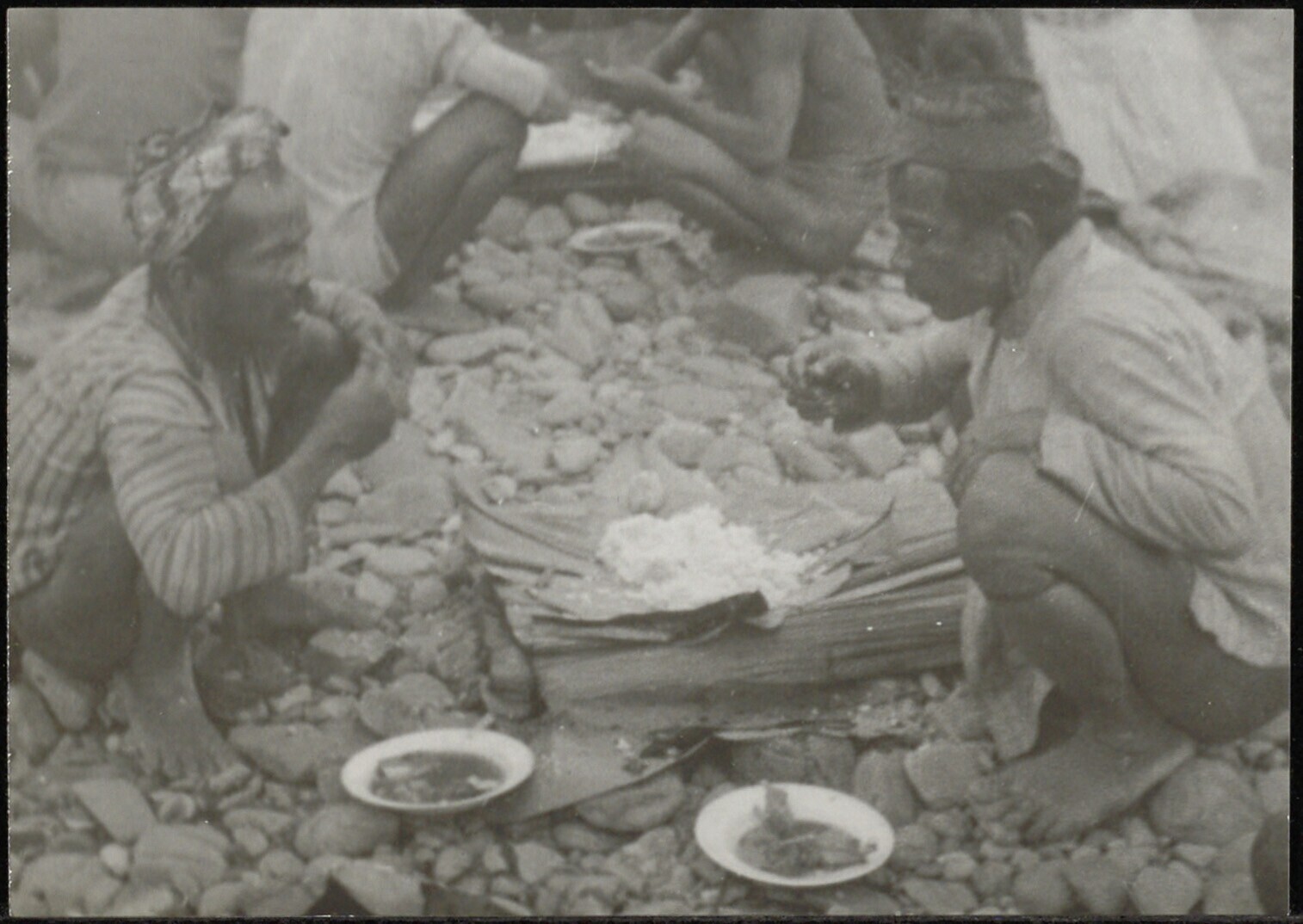 Mannen een rijstmaaltijd nuttigend aan de rotsachtige oever van de Segah-Kelai