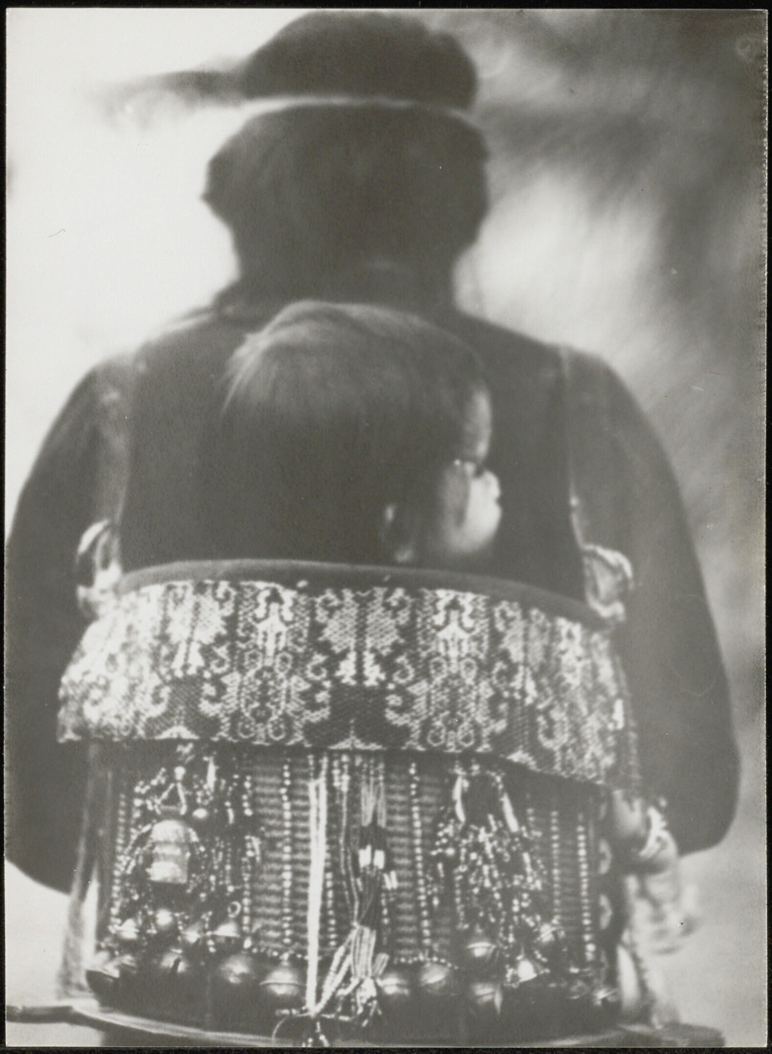 Moeder met een kind in een rijk gedecoreerde draagzak op haar rug van achter gezien