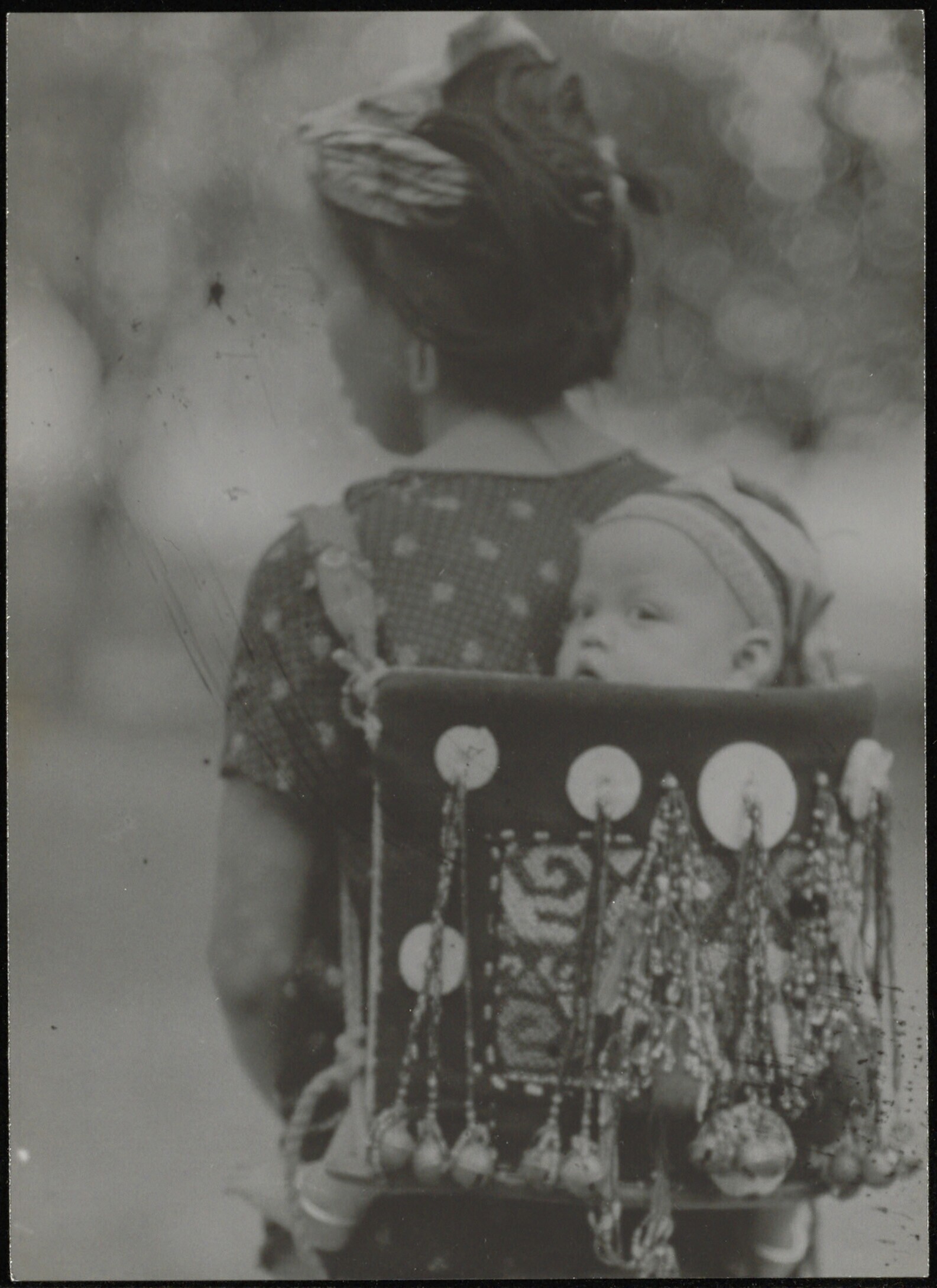 Moeder met een kind in een rijk gedecoreerde draagzak op haar rug
