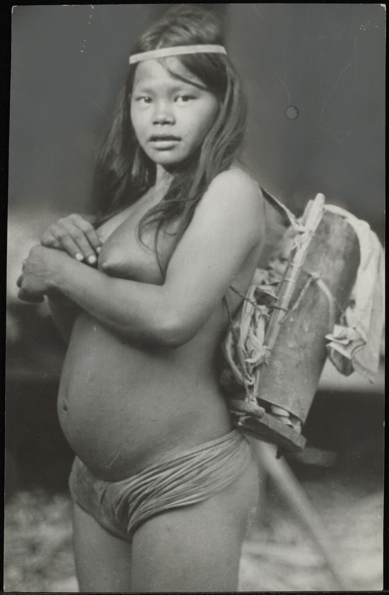 Een Poenan Dayak vrouw met kind in een zitje op haar rug
