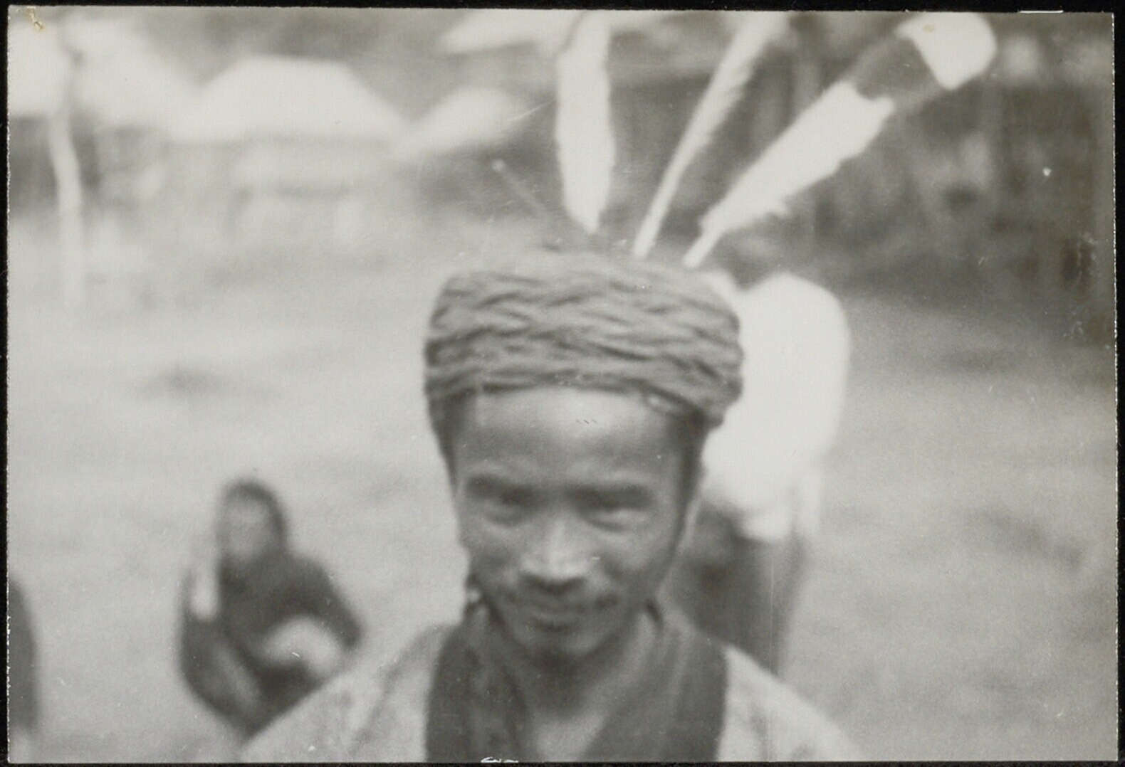 Portret van een Dayak man met een met veren versierde hoofddoek