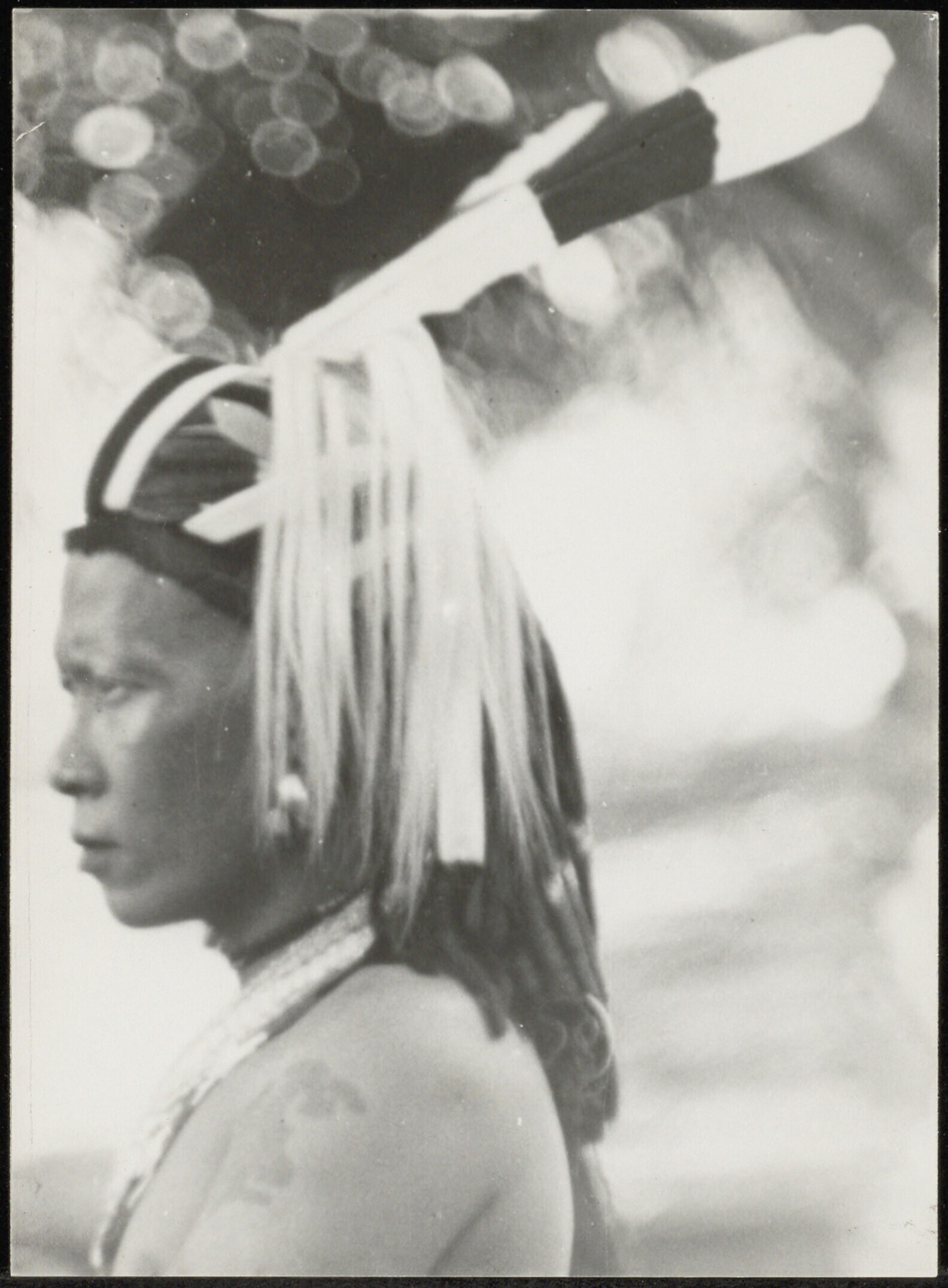 Portret van een Batang Lupar Dayak jongen met een hoofdtooi met veren en een arm-tatoeage