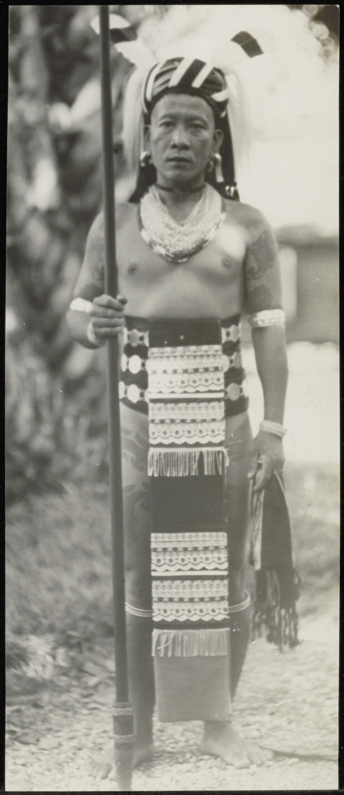Portret van een Batang Lupar Dayak man in krijgsuitrusting met blaasroer