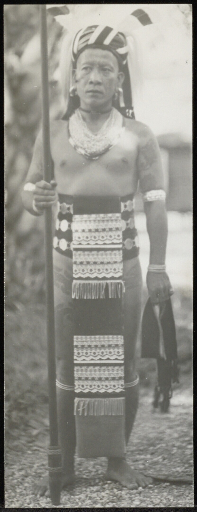 Portret van een Batang Lupar Dayak man in krijgsuitrusting met blaasroer