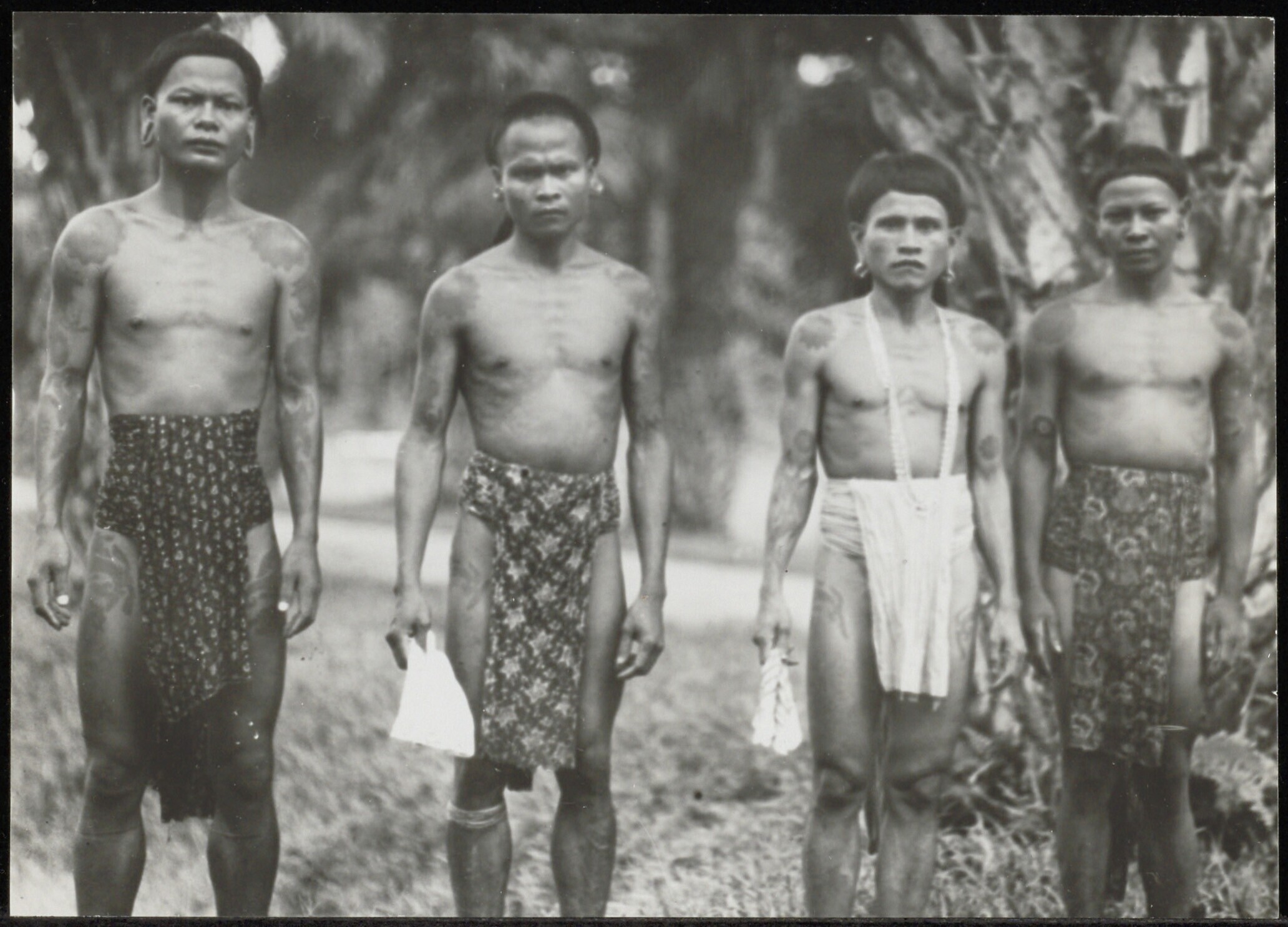 Groepsportret van getatoeërde Dayak mannen met lendendoeken